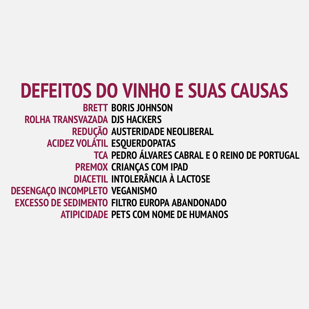 O post atribui causas absurdas e políticas/sociais para defeitos técnicos comuns do vinho, misturando conceitos técnicos com o noticiário e comportamentos da época (2019):
