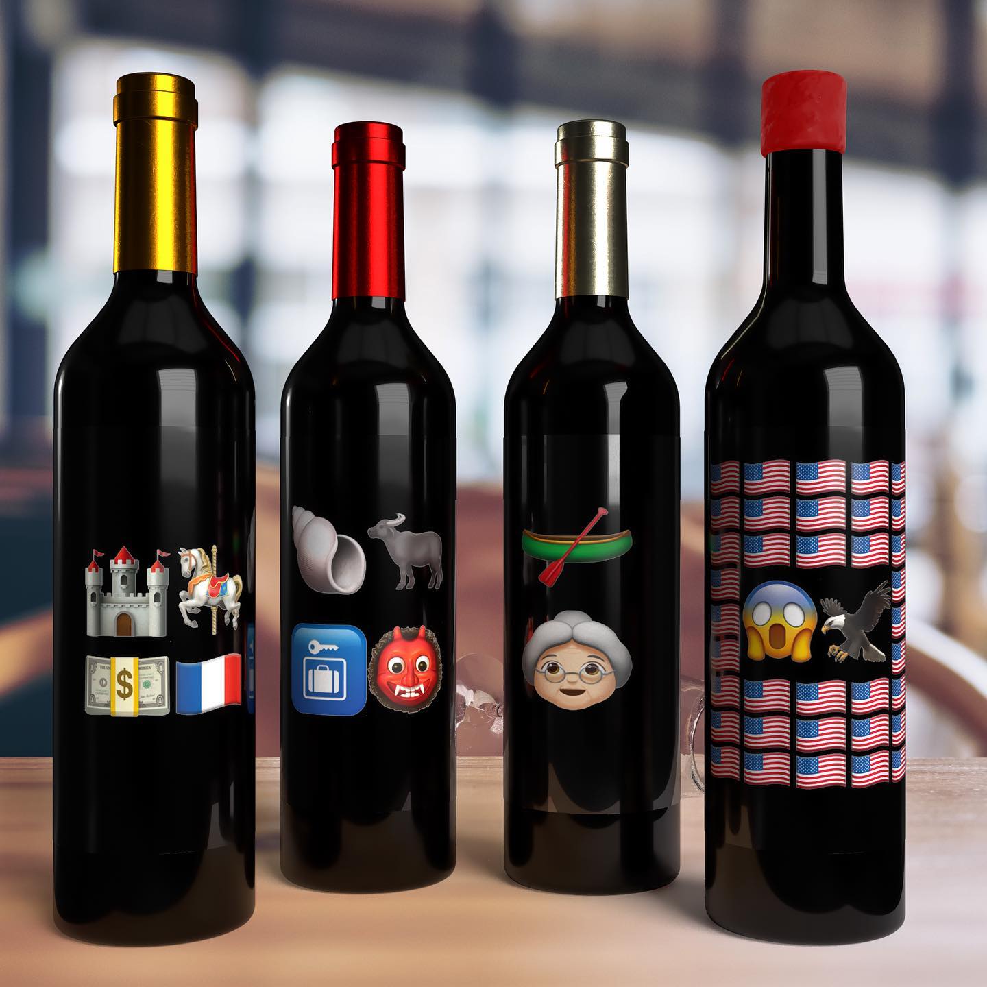 A imagem mostra quatro garrafas de vinho sobre uma mesa, mas seus rótulos foram substituídos por sequências de Emojis (como charadas visuais ou "Rebus").
