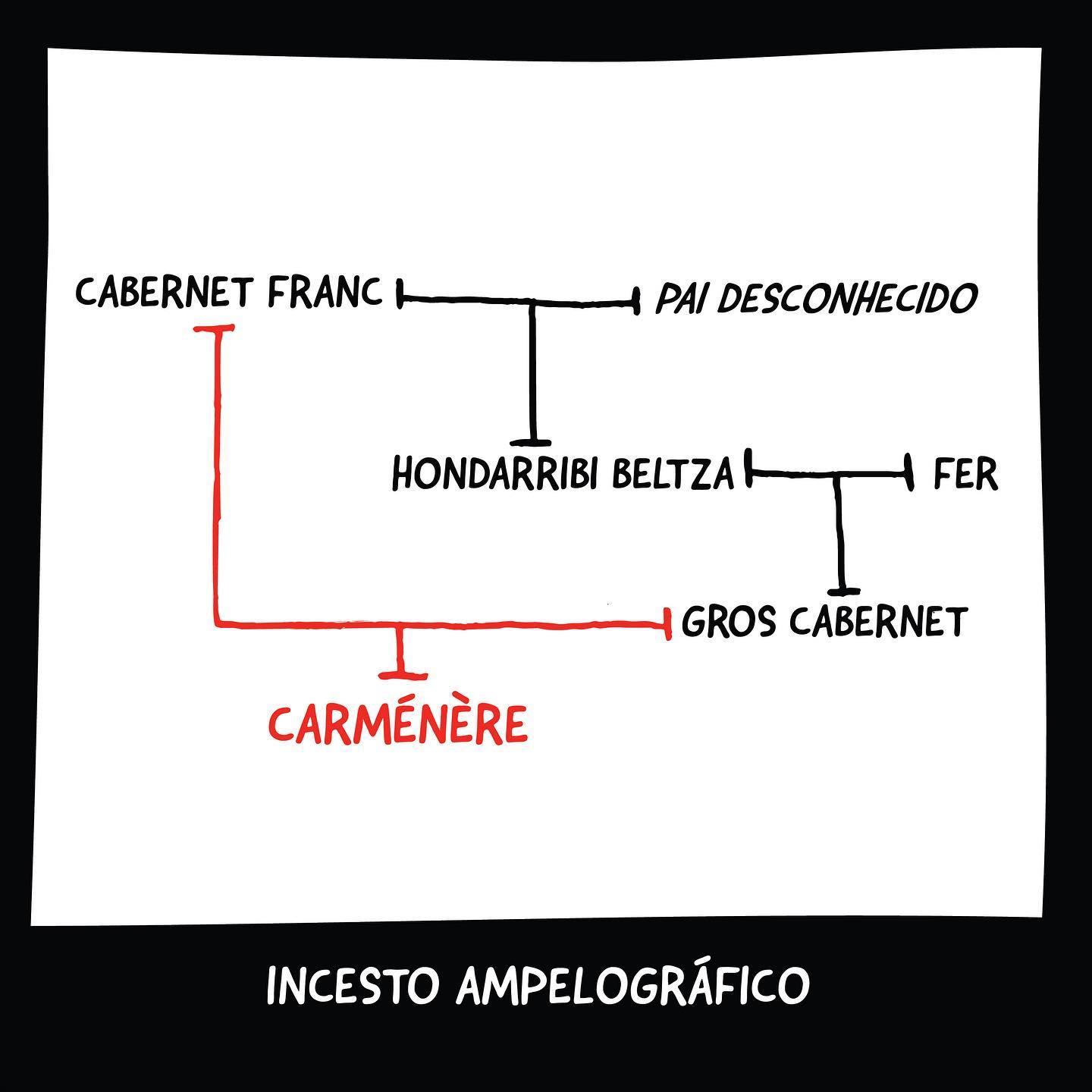 Uma linha vermelha destaca que a Cabernet Franc é, ao mesmo tempo, mãe e bisavó da Carménère.