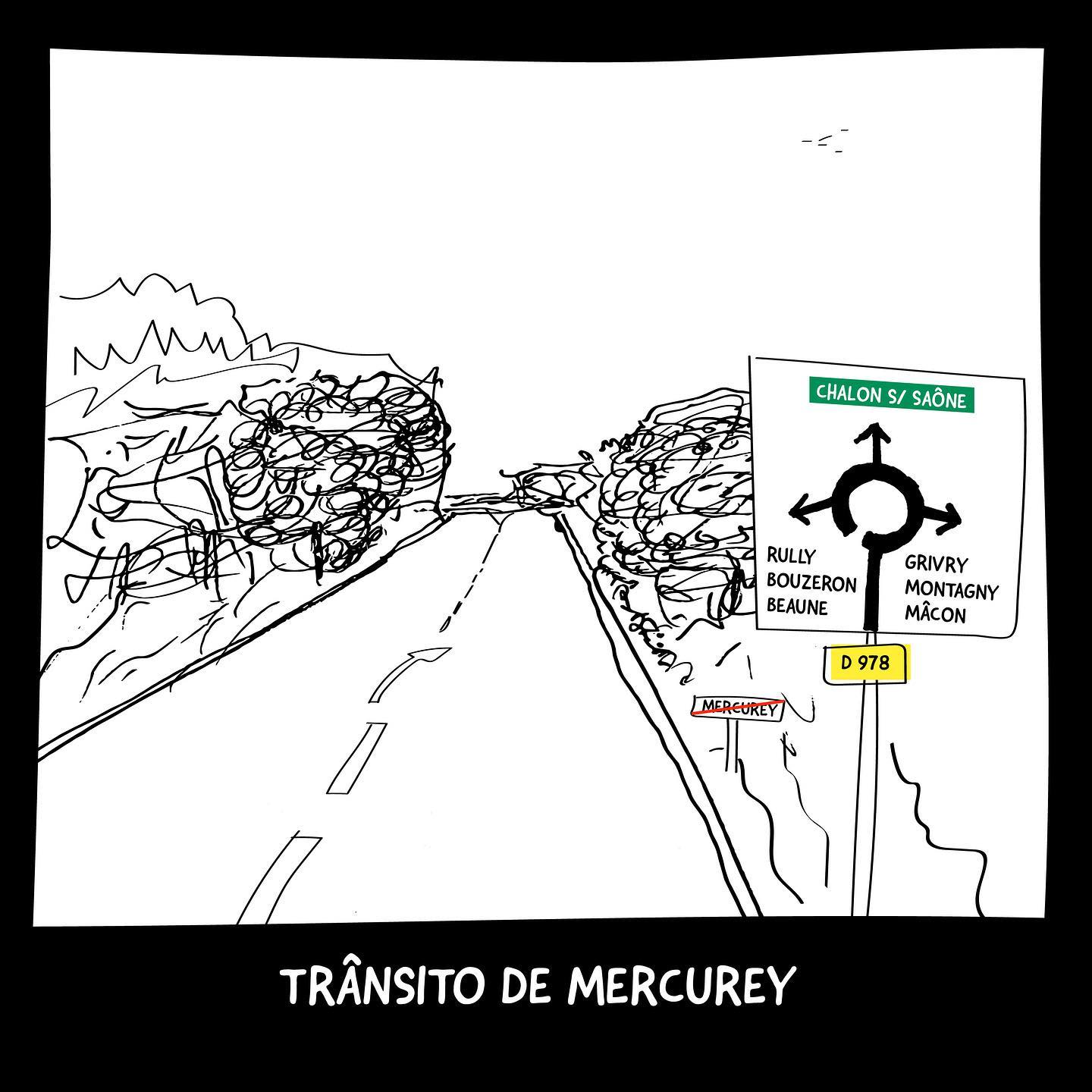 Logo abaixo, uma placa menor aponta para Mercurey à esquerda, mas o nome está tachado (riscado em vermelho). No rodapé da imagem, a frase: "TRÂNSITO DE MERCUREY".