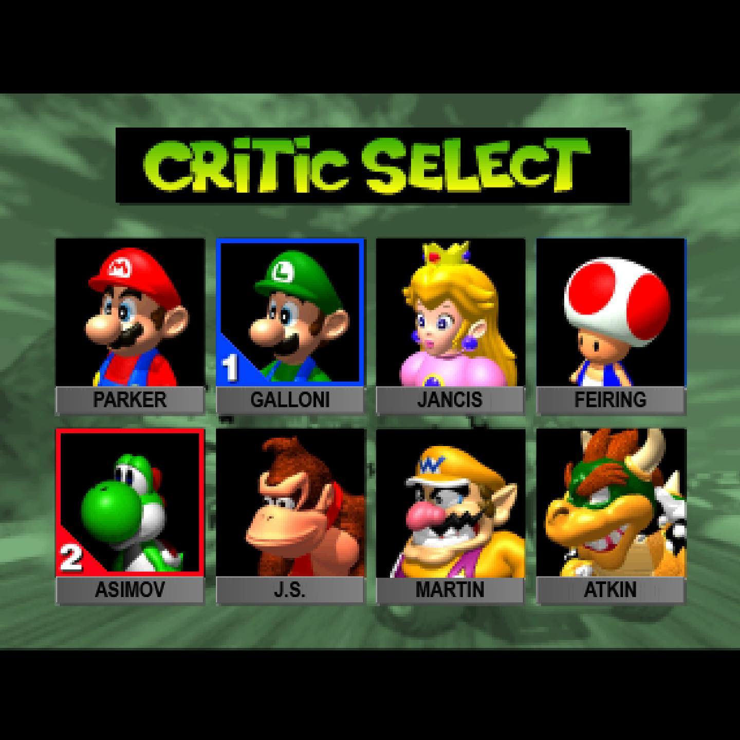 [Tela de seleção de personagens do jogo Mario Kart 64, modificada com nomes de críticos de vinho abaixo dos personagens]