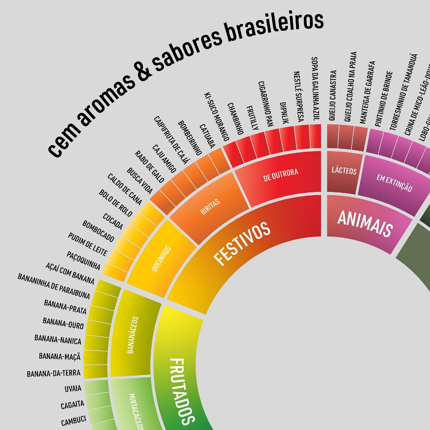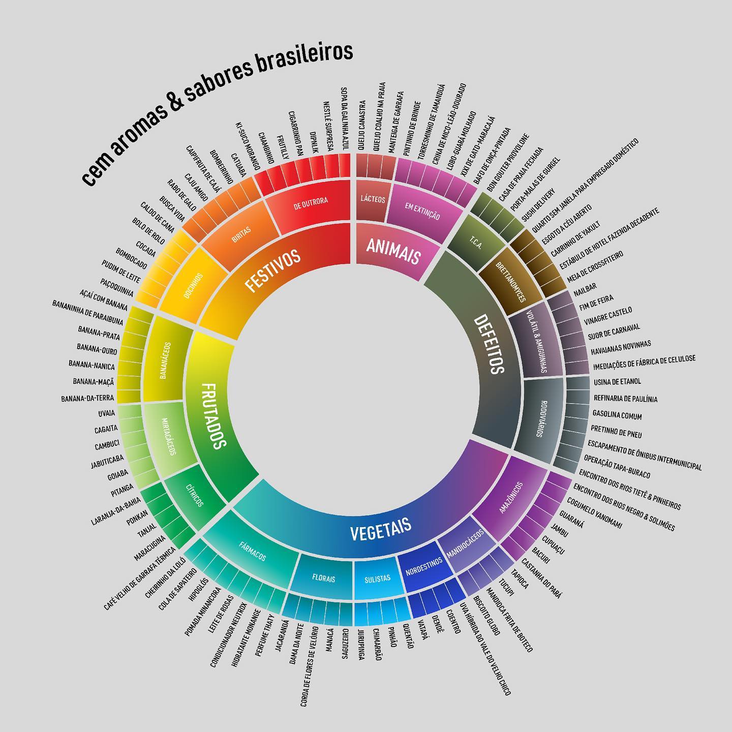 Este post apresenta o "Cem Aromas & Sabores Brasileiros", uma roda de aromas satírica criada pelo Bebi o Dicionário. Parodiando as ferramentas sérias de sommeliers (como o Le Nez du Vin), o pôster substitui descritores clássicos franceses ou europeus por referências brasileiras, muitas vezes nostálgicas, populares ou grosseiras.