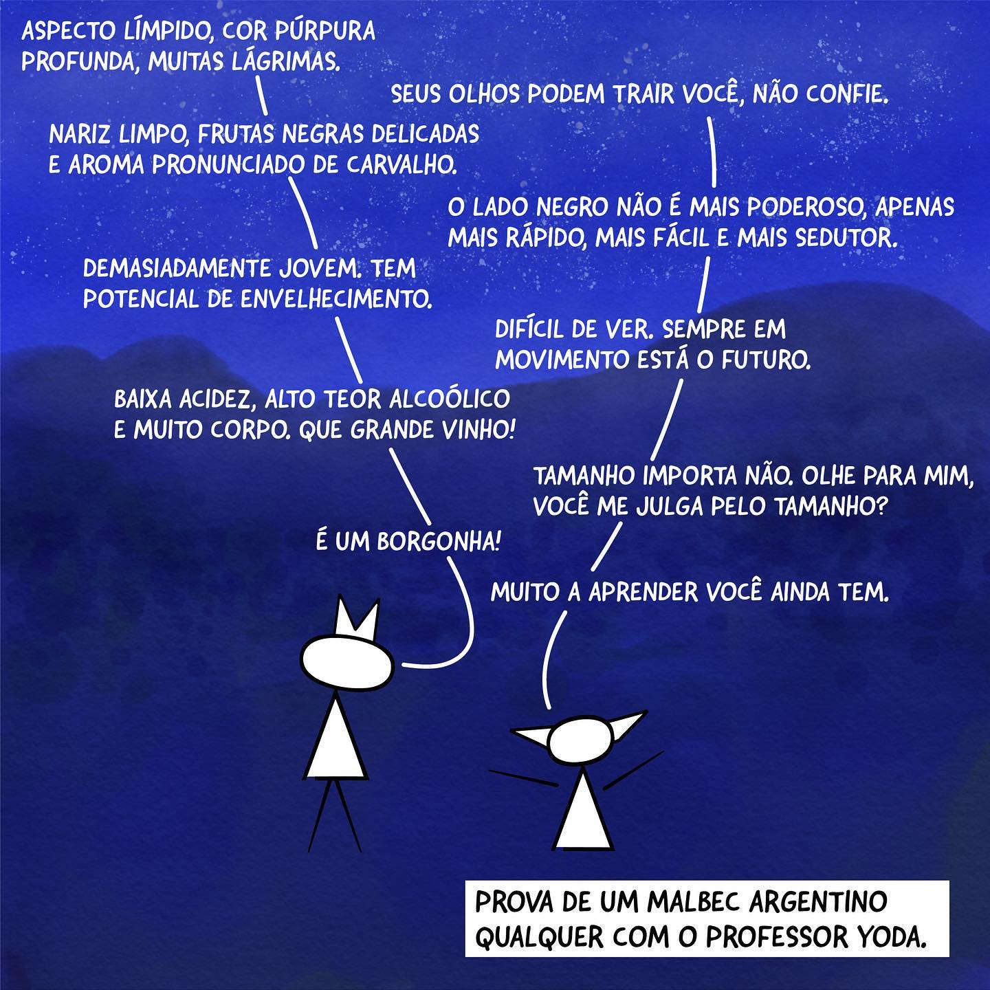 Aluno: "NARIZ LIMPO, FRUTAS NEGRAS DELICADAS E AROMA PRONUNCIADO DE CARVALHO." Yoda: "O LADO NEGRO NÃO É MAIS PODEROSO, APENAS MAIS RÁPIDO, MAIS FÁCIL E MAIS SEDUTOR."