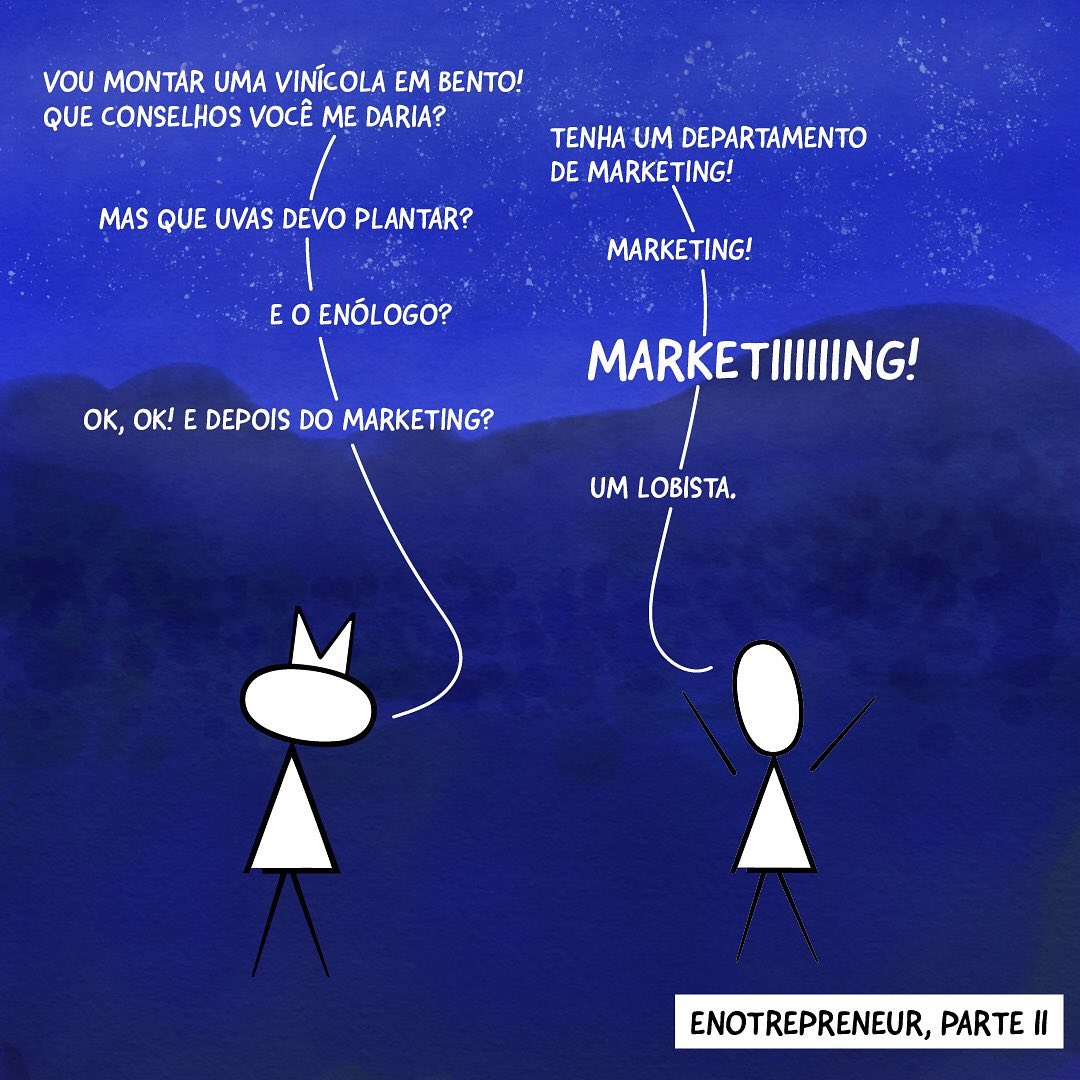 Empreendedor: "VOU MONTAR UMA VINÍCOLA EM BENTO! QUE CONSELHOS VOCÊ ME DARIA?" Consultor: "TENHA UM DEPARTAMENTO DE MARKETING!" Empreendedor: "MAS QUE UVAS DEVO PLANTAR?" Consultor: "MARKETING!" Empreendedor: "E O ENÓLOGO?" Consultor: "MARKETIIIIIING!" Empreendedor: "OK, OK! E DEPOIS DO MARKETING?" Consultor: "UM LOBISTA."