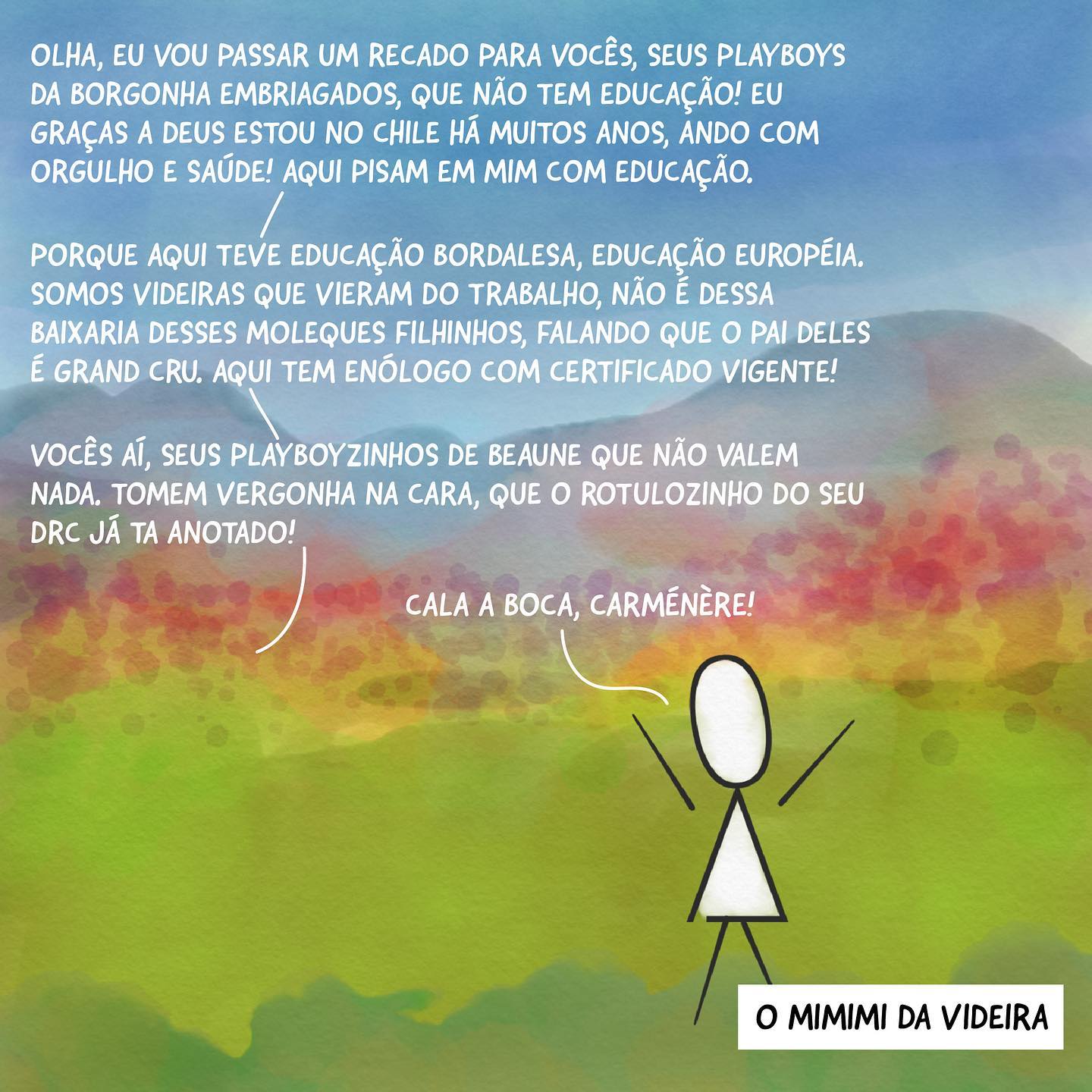 O texto é uma paródia de um famoso áudio viral brasileiro (conhecido como "Cala a boca, Tati" ou "Desabafo no condomínio"), adaptado para o mundo do vinho. A sátira personifica um vinhedo de Carménère no Chile como alguém desequilibrado, defendendo agressivamente sua origem ("educação bordalesa") e status de trabalhadora contra a suposta arrogância das uvas da Borgonha ("playboys"). A legenda "desequilibrada" faz um duplo sentido com o perfil sensorial vegetal da uva (muitas vezes criticado por excesso de pirazina/pimentão) e o surto psicótico demonstrado na tirinha.