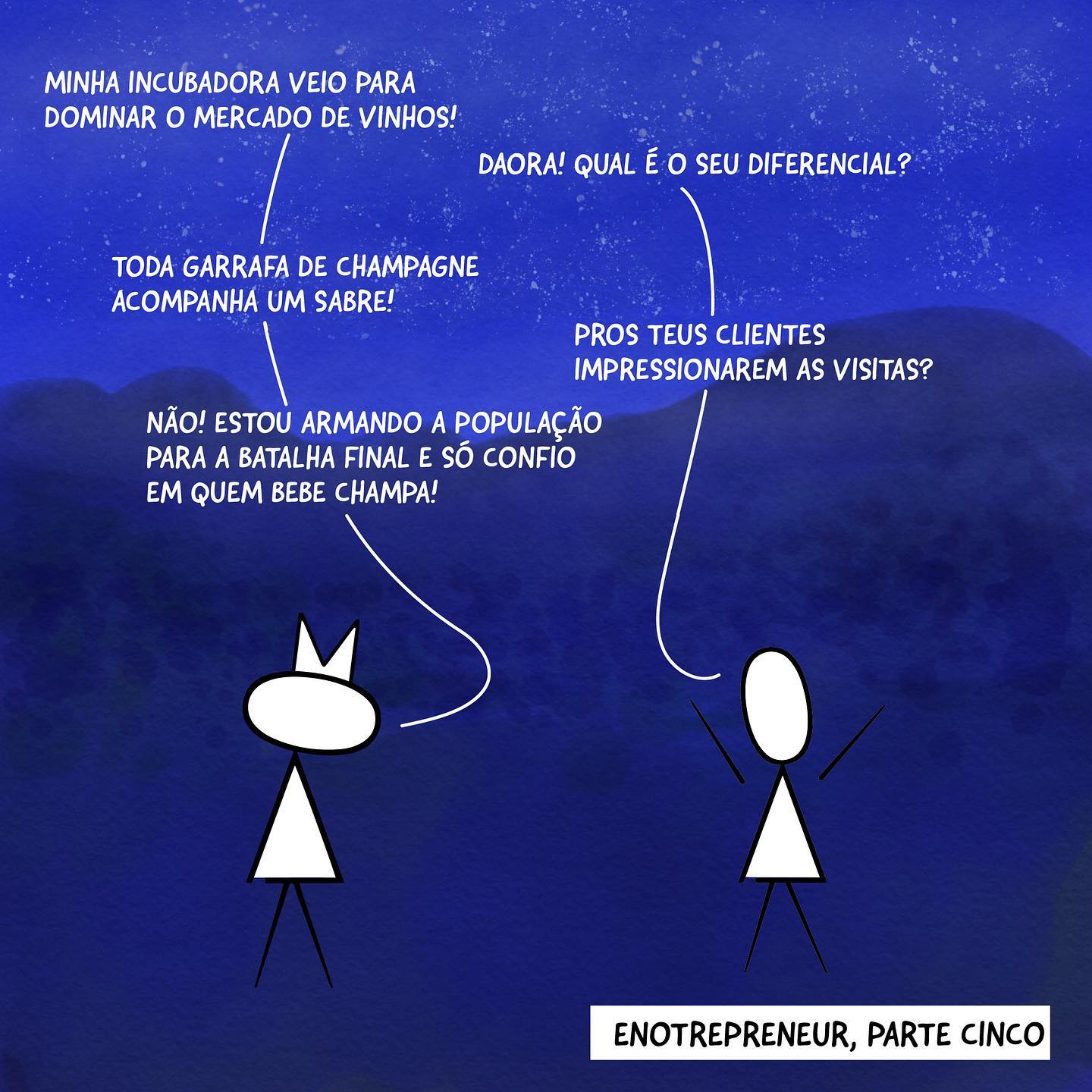 Tira cômica da série "ENOTREPRENEUR, PARTE CINCO". Personagens de palitinho.