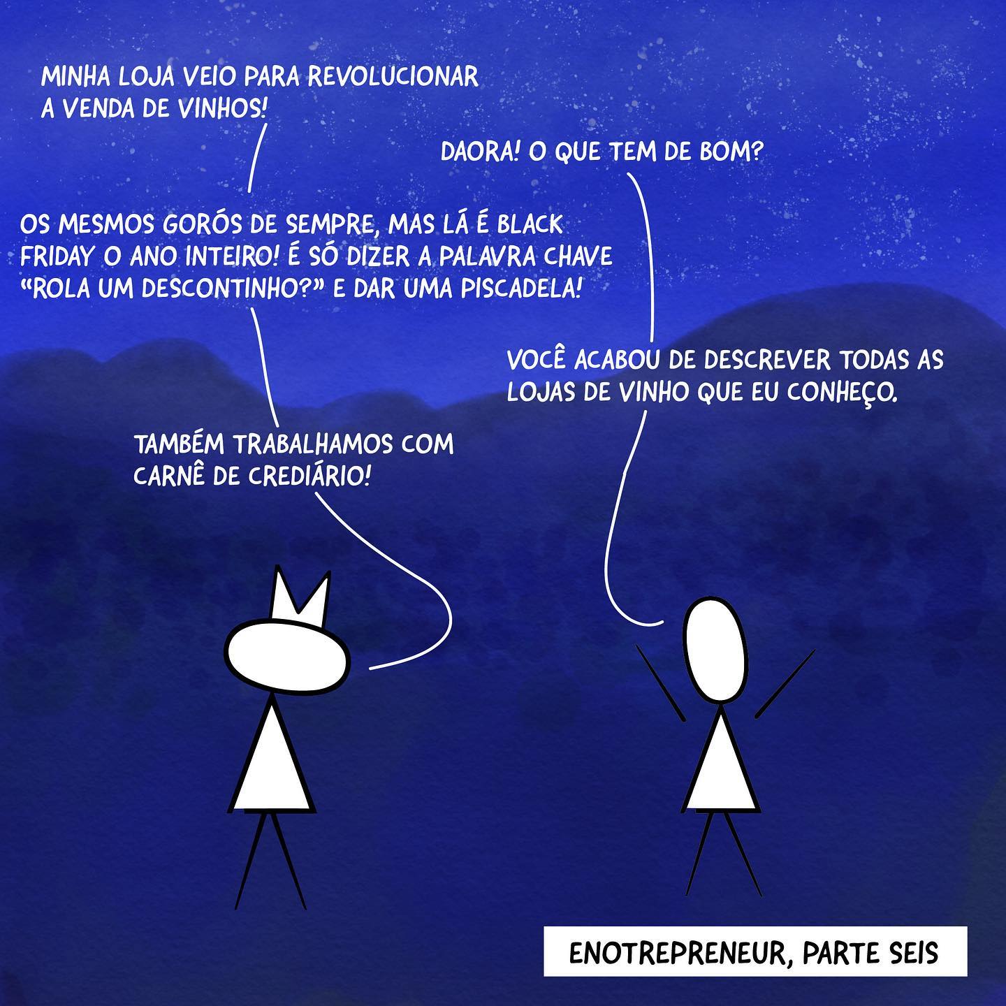 Tira cômica da série "ENOTREPRENEUR, PARTE SEIS" (no rodapé). Personagens de palitinho sob céu estrelado.