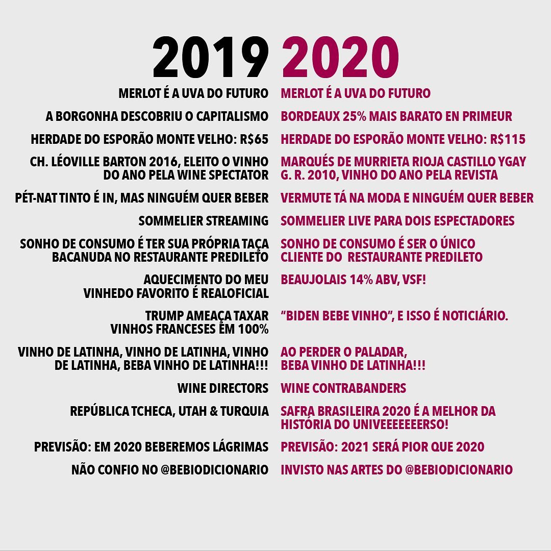 O post é uma retrospectiva satírica do ano de 2020, comparando-o com 2019 e destacando os impactos da pandemia de COVID-19 e outras tendências do mercado de vinhos.