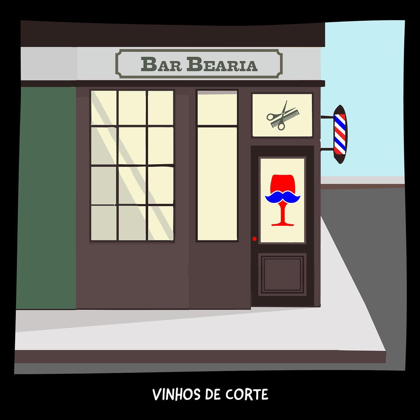 Ilustração vetorial da fachada de um estabelecimento chamado "Bar Bearia". Na vitrine, o ícone de uma taça de vinho tinto com um bigode azul (estilo hipster). Acima, o símbolo clássico de barbearia (cilindro tricolor). Texto abaixo: "VINHOS DE CORTE".