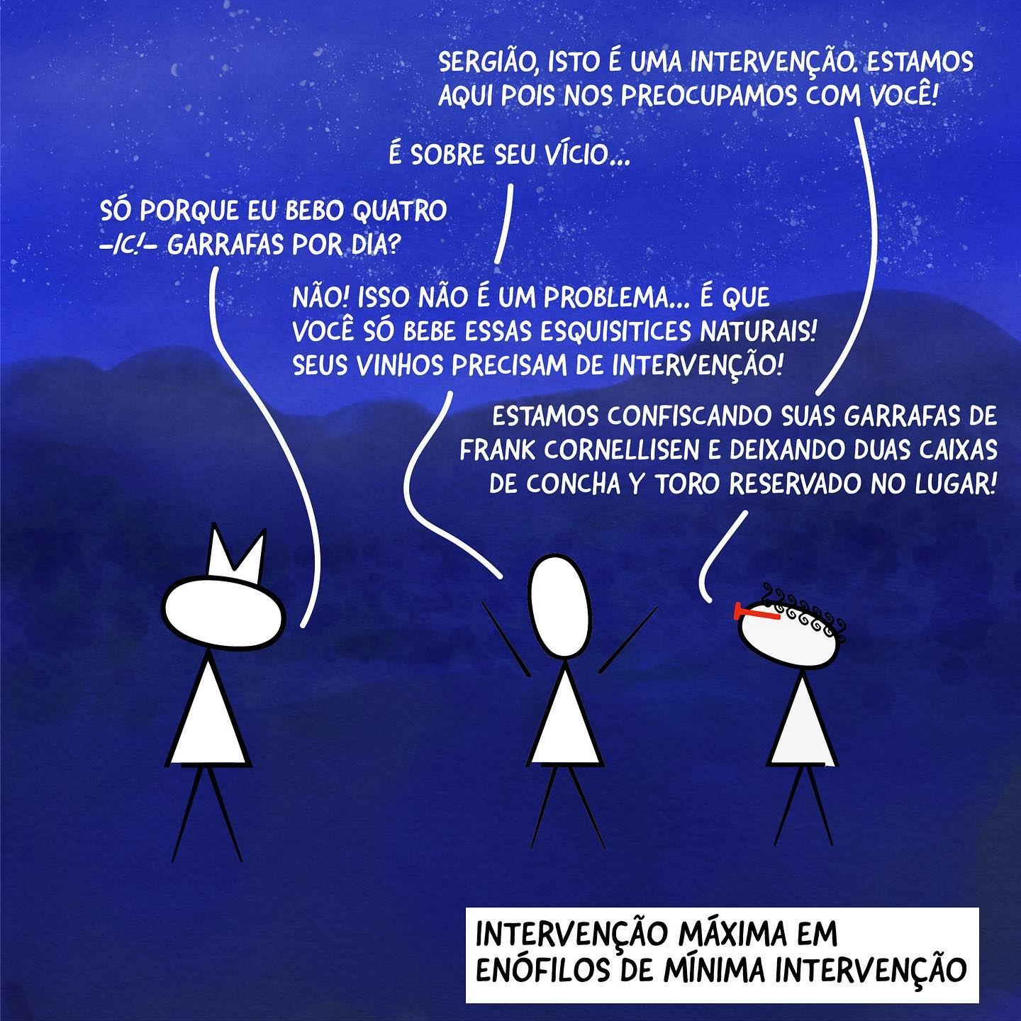 Tira cômica intitulada "INTERVENÇÃO MÁXIMA EM ENÓFILOS DE MÍNIMA INTERVENÇÃO". Cena: Três personagens (bonecos palito) conversam com um quarto personagem (Sergião) que usa uma coroa (talvez referência a ser o "rei" dos naturais?).