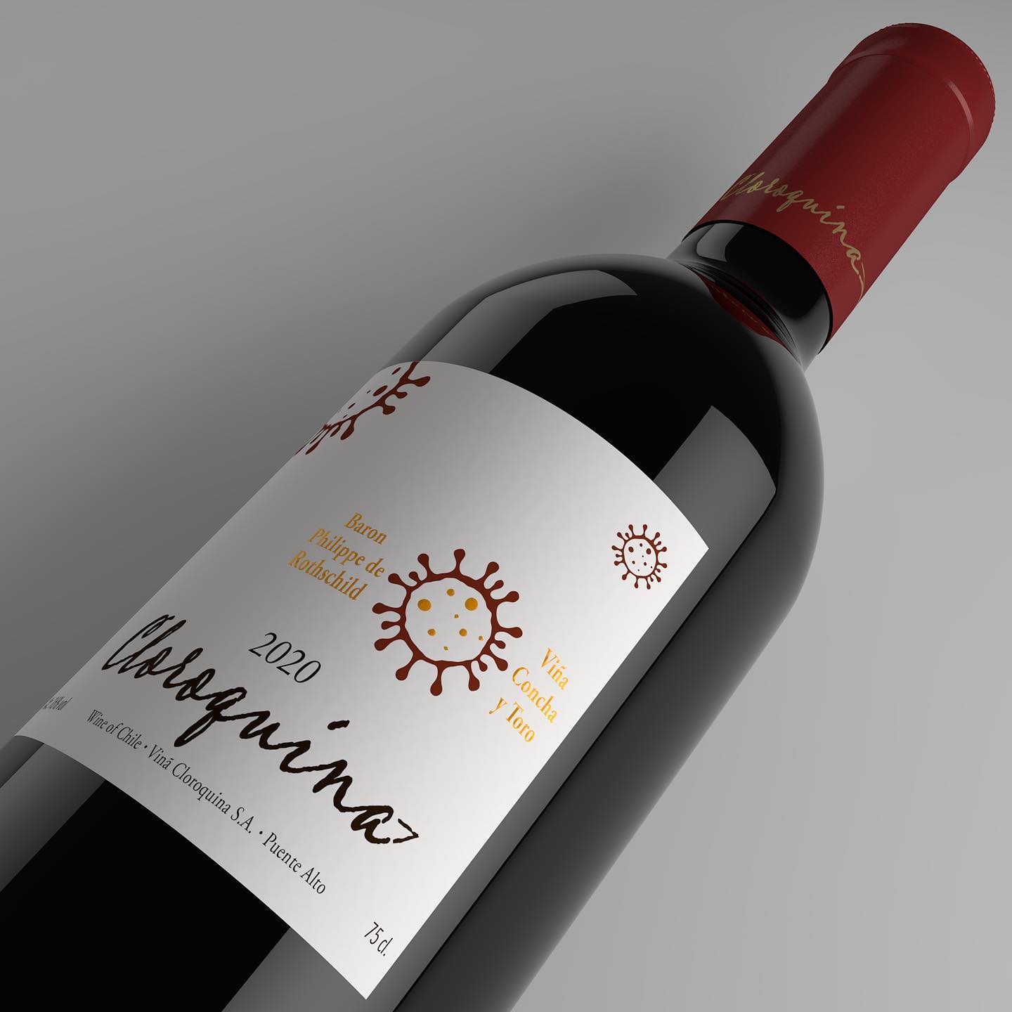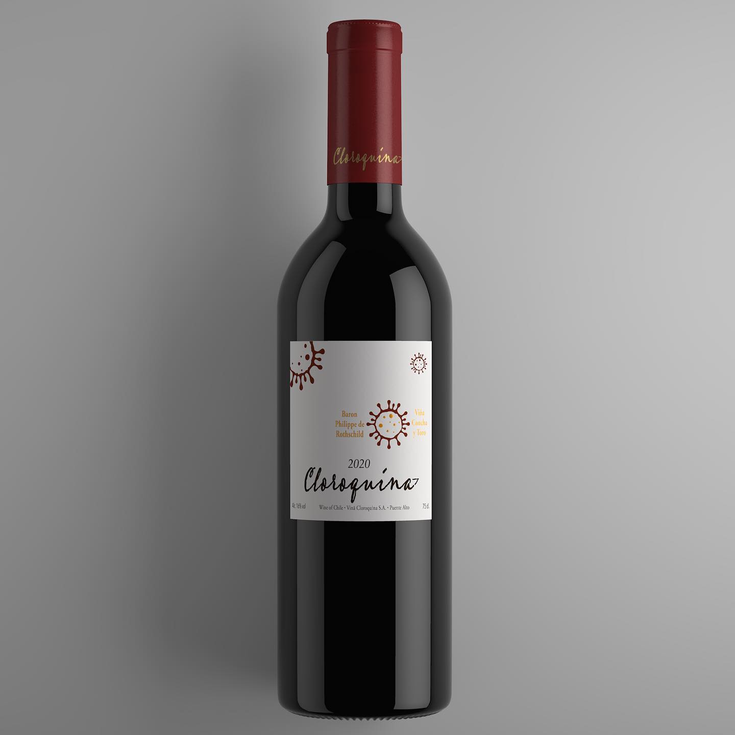 Imagem 1: Uma garrafa de vinho tinto com um rótulo branco e letras clássicas (estilo Bordeaux). Nome do vinho: Cloroquina (em fonte cursiva elegante, imitando o logo do Almaviva). O rótulo tem desenhos estilizados do coronavírus (bolinhas com espinhos) em vermelho e dourado, imitando os símbolos mapuches do rótulo original. Texto menor: "Baron Philippe de Rothschild" (joint venture com Concha y Toro). Safra: 2020.