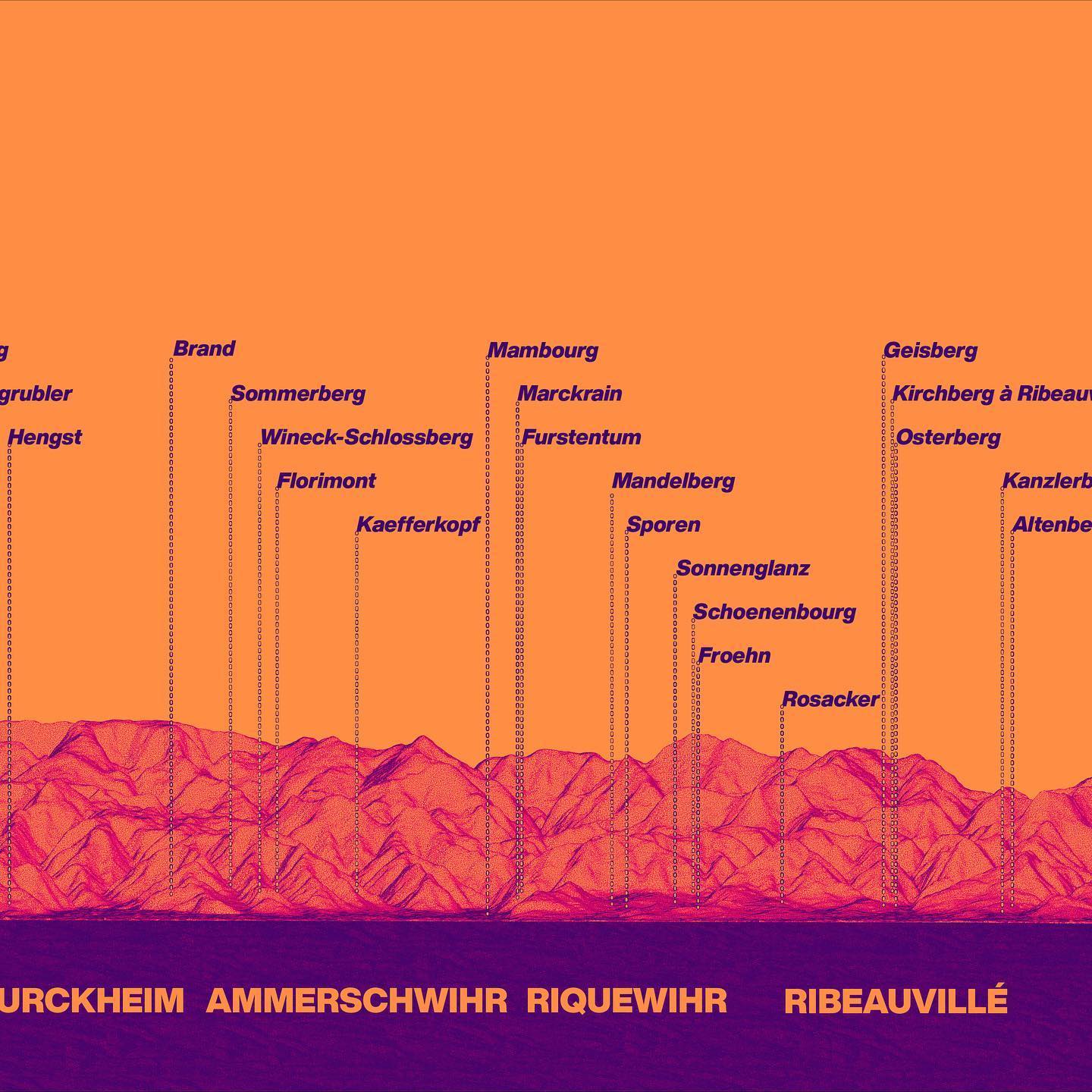 Apresentando o mapa mais desnecessariamente longo da história da Alsácia. Cinquenta Grand Crus mapeados em projeção paralela, sobre a cadeia de montanhas dos Vosges (aqui apresentada em escala vertical exagerada em três vezes). São 111 megapixels de puro suor e açúcar residual.