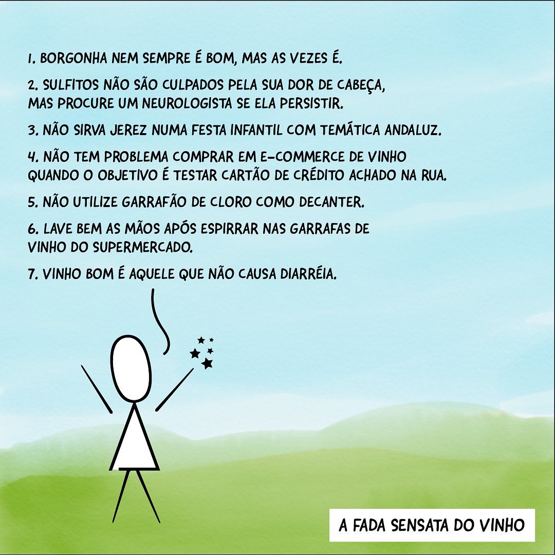 Uma lista de conselhos absurdos misturados com verdades inconvenientes, satirizando mitos do vinho (sulfitos, qualidade da Borgonha) e comportamentos bizarros da pandemia (higiene em supermercado) ou fraudes (cartão de crédito). O termo "Fada Sensata" era um meme popular na época para designar alguém que diz verdades óbvias e lúcidas.