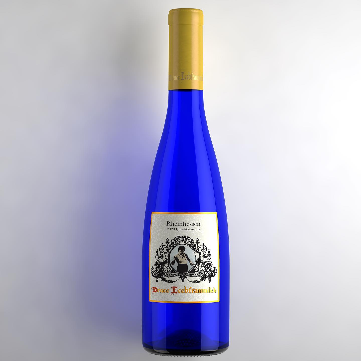 Uma renderização em 3D de uma garrafa de vinho azul alongada (típica dos vinhos alemães baratos exportados nos anos 80/90, como o Liebfraumilch da marca "Blue Nun" ou similares). O rótulo, em estilo gótico alemão, traz a imagem do lutador Bruce Lee em pose de combate. O nome do vinho é "Bruce Leebfraumilch". Texto no rótulo: "Rheinhessen - 2020 Qualitätswein".