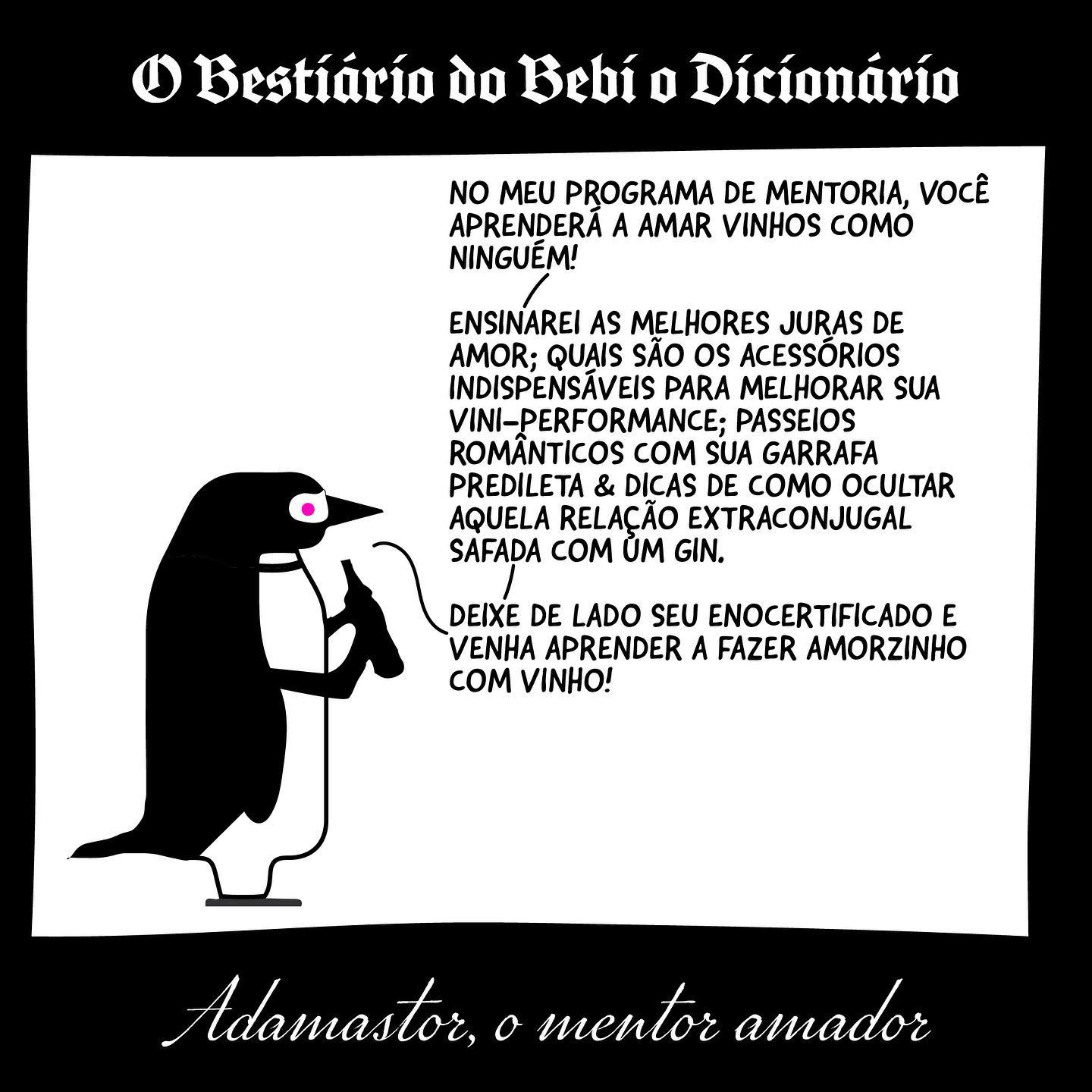 Desenho de um pinguim (Adamastor) bebendo direto da garrafa. Título: O Bestiário do Bebí o Dicíonário Subtítulo: Adamastor, o mentor amador