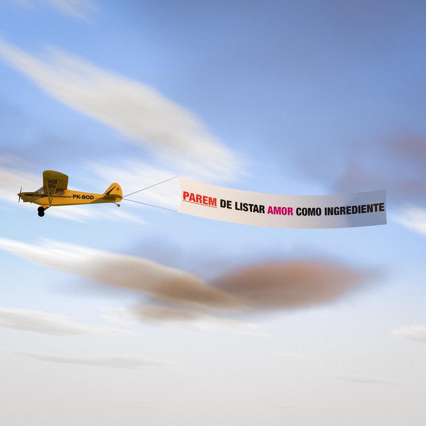 Uma renderização em 3D de um avião amarelo puxando uma faixa publicitária no céu. A faixa diz: "PAREM DE LISTAR AMOR COMO INGREDIENTE"