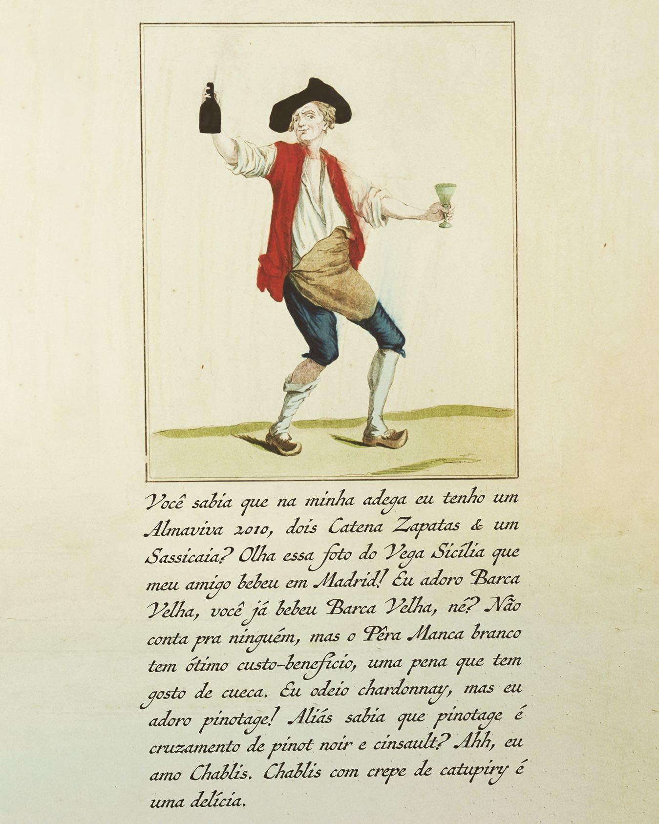 "Você sabia que na minha adega eu tenho um Almaviva 2010, dois Catena Zapatas & um Sassicaia? Olha essa foto do Vega Sicília que meu amigo bebeu em Madrid! Eu adoro Barca Velha, você já bebeu Barca Velha, né? Não conta pra ninguém, mas o Pêra Manca branco tem ótimo custo-benefício, uma pena que tem gosto de cueca. Eu odeio chardonnay, mas eu adoro pinotage! Aliás sabia que pinotage é cruzamento de pinot noir e cinsault? Ahh, eu amo Chablis. Chablis com crepe de catupiry é uma delícia."