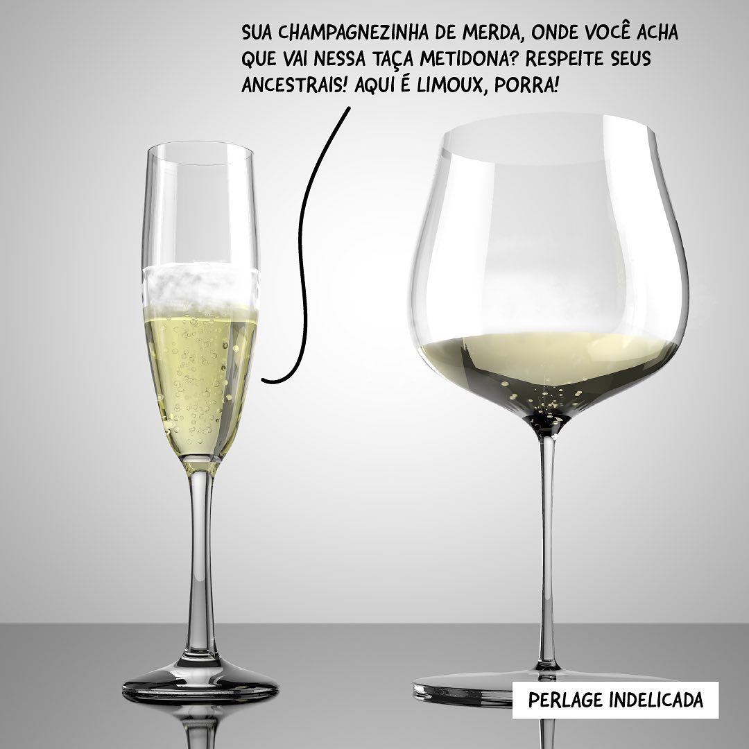 Taça Moderna (para a Flûte): "SUA CHAMPAGNEZINHA DE MERDA, ONDE VOCÊ ACHA QUE VAI NESSA TAÇA METIDONA? RESPEITE SEUS ANCESTRAIS! AQUI É LIMOUX, PORRA!"