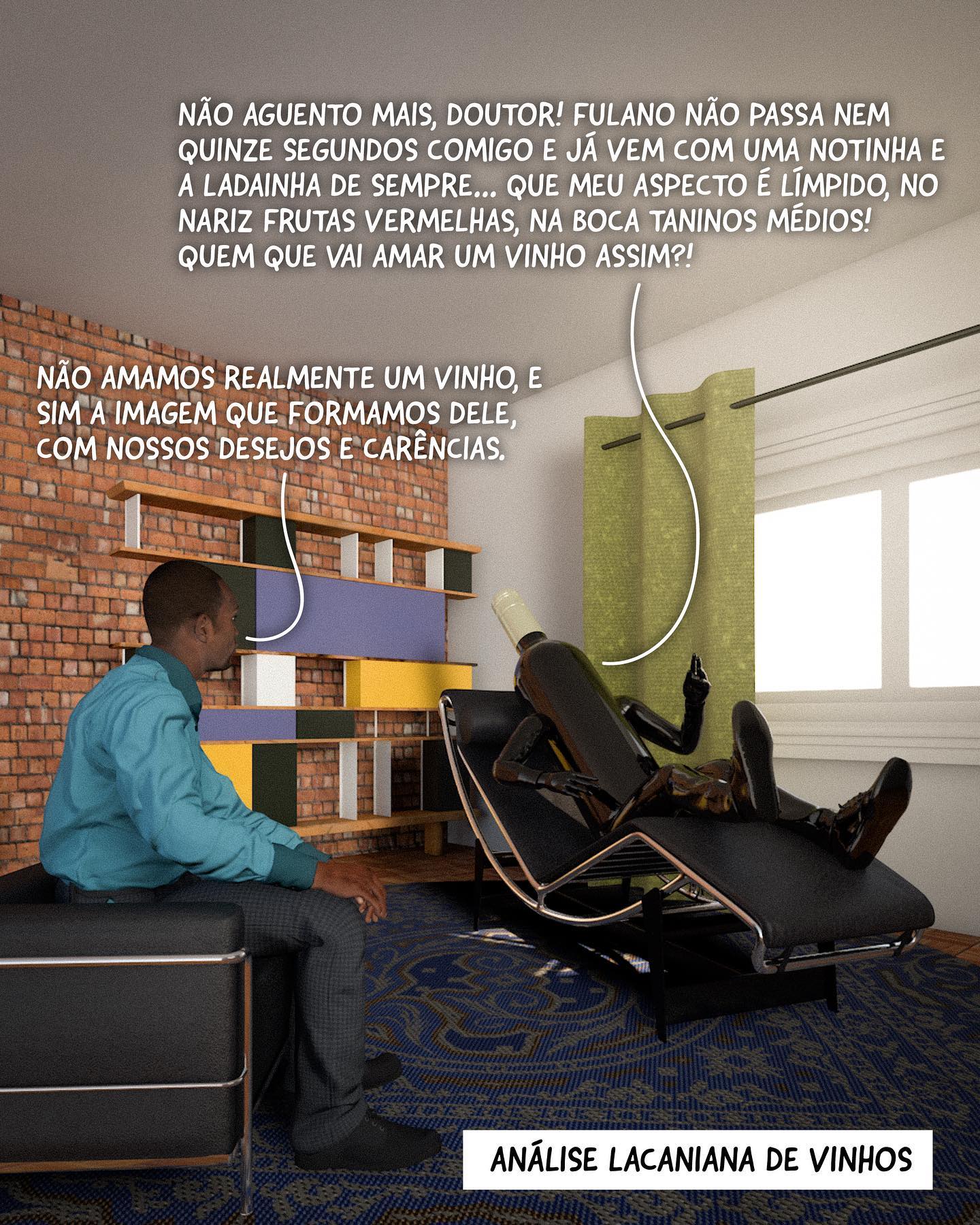 Vinho (Paciente): "NÃO AGUENTO MAIS, DOUTOR! FULANO NÃO PASSA NEM QUINZE SEGUNDOS COMIGO E JÁ VEM COM UMA NOTINHA E A LADAINHA DE SEMPRE... QUE MEU ASPECTO É LÍMPIDO, NO NARIZ FRUTAS VERMELHAS, NA BOCA TANINOS MÉDIOS! QUEM QUE VAI AMAR UM VINHO ASSIM?!" Analista: "NÃO AMAMOS REALMENTE UM VINHO, E SIM A IMAGEM QUE FORMAMOS DELE, COM NOSSOS DESEJOS E CARÊNCIAS."
