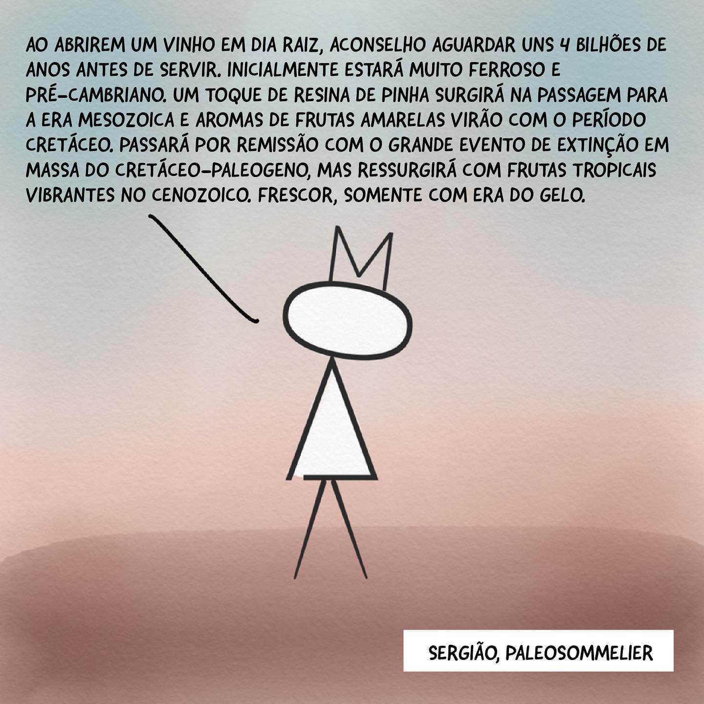 Sergião: "AO ABRIREM UM VINHO EM DIA RAIZ, ACONSELHO AGUARDAR UNS 4 BILHÕES DE ANOS ANTES DE SERVIR. INICIALMENTE ESTARÁ MUITO FERROSO E PRÉ-CAMBRIANO. UM TOQUE DE RESINA DE PINHA SURGIRÁ NA PASSAGEM PARA A ERA MESOZOICA E AROMAS DE FRUTAS AMARELAS VIRÃO COM O PERÍODO CRETÁCEO. PASSARÁ POR REMISSÃO COM O GRANDE EVENTO DE EXTINÇÃO EM MASSA DO CRETÁCEO-PALEOGENO, MAS RESSURGIRÁ COM FRUTAS TROPICAIS VIBRANTES NO CENOZOICO. FRESCOR, SOMENTE COM ERA DO GELO."