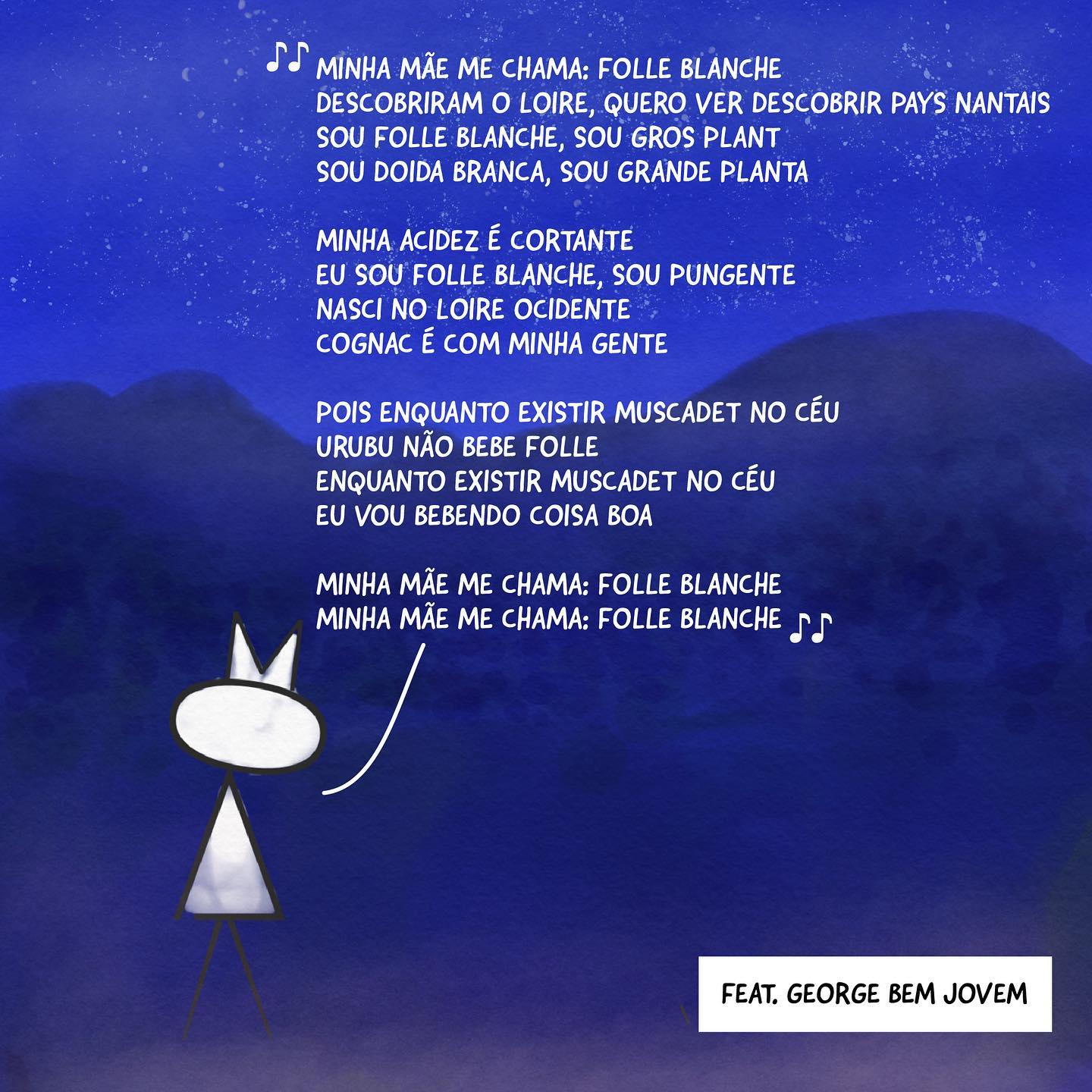 POIS ENQUANTO EXISTIR MUSCADET NO CÉU URUBU NÃO BEBE FOLLE ENQUANTO EXISTIR MUSCADET NO CÉU EU VOU BEBENDO COISA BOA"