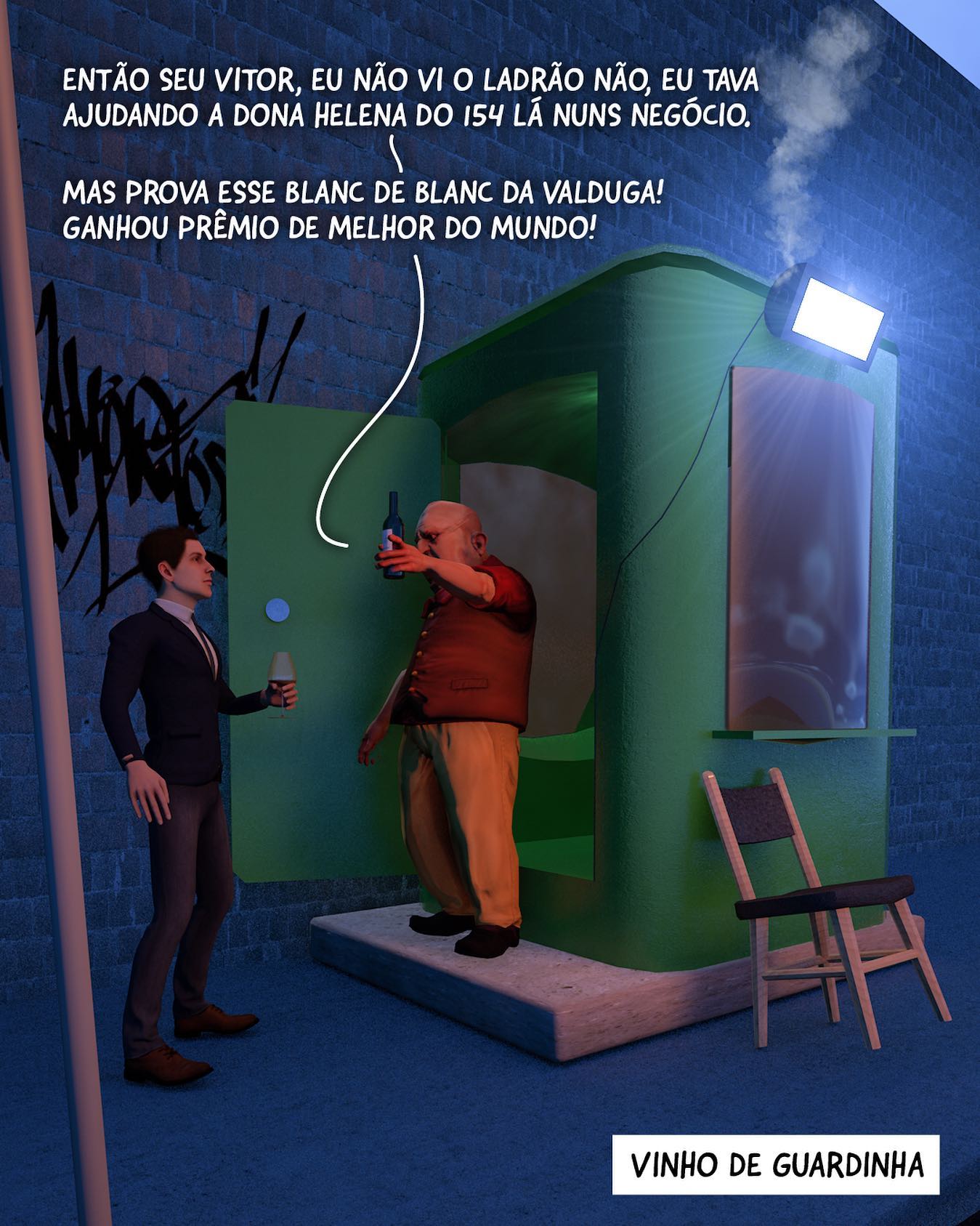 O post é um trocadilho visual entre o termo enológico "Vinho de Guarda" (vinho com potencial para envelhecer muitos anos na adega) e a figura popular do "Guardinha" (vigilante noturno de rua). A cena ilustra literalmente um "vinho de guardinha": um sommelier compartilhando um espumante premiado (referência ao Casa Valduga 130 ou similar que frequentemente ganha prêmios internacionais) com o vigia da rua durante o turno da noite. A legenda também satiriza o ufanismo com prêmios internacionais ("ganhou medalha de ouro... a melhor guarita do mundo é brasileira"), comum no marketing do vinho brasileiro.