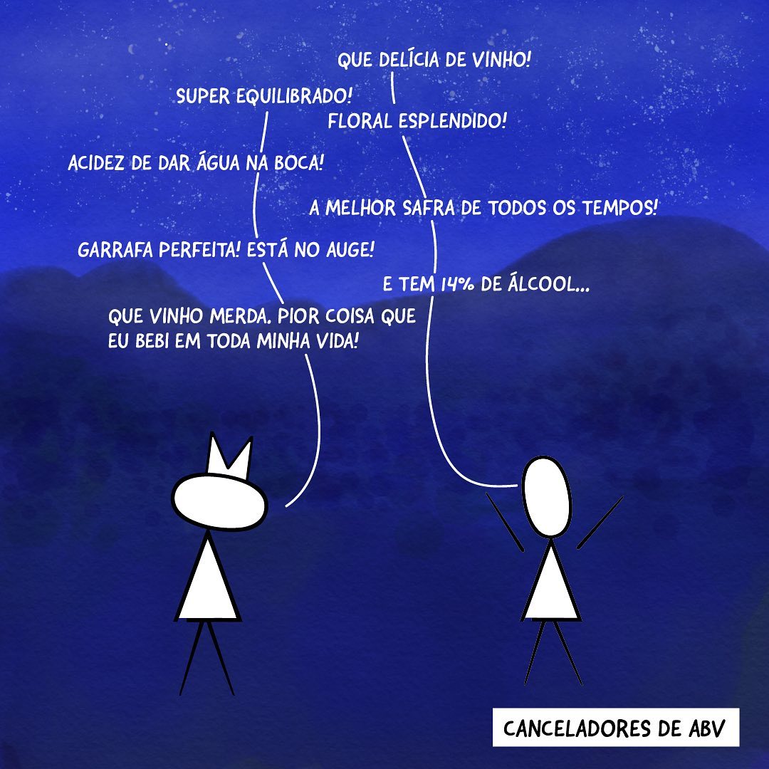 Personagem 1 (entusiasmado): "QUE DELÍCIA DE VINHO! SUPER EQUILIBRADO! FLORAL ESPLENDIDO! ACIDEZ DE DAR ÁGUA NA BOCA! A MELHOR SAFRA DE TODOS OS TEMPOS! GARRAFA PERFEITA! ESTÁ NO AUGE!" Personagem 2 (observando): "E TEM 14% DE ÁLCOOL..." Personagem 1 (muda totalmente de expressão): "QUE VINHO MERDA. PIOR COISA QUE EU BEBI EM TODA MINHA VIDA!"