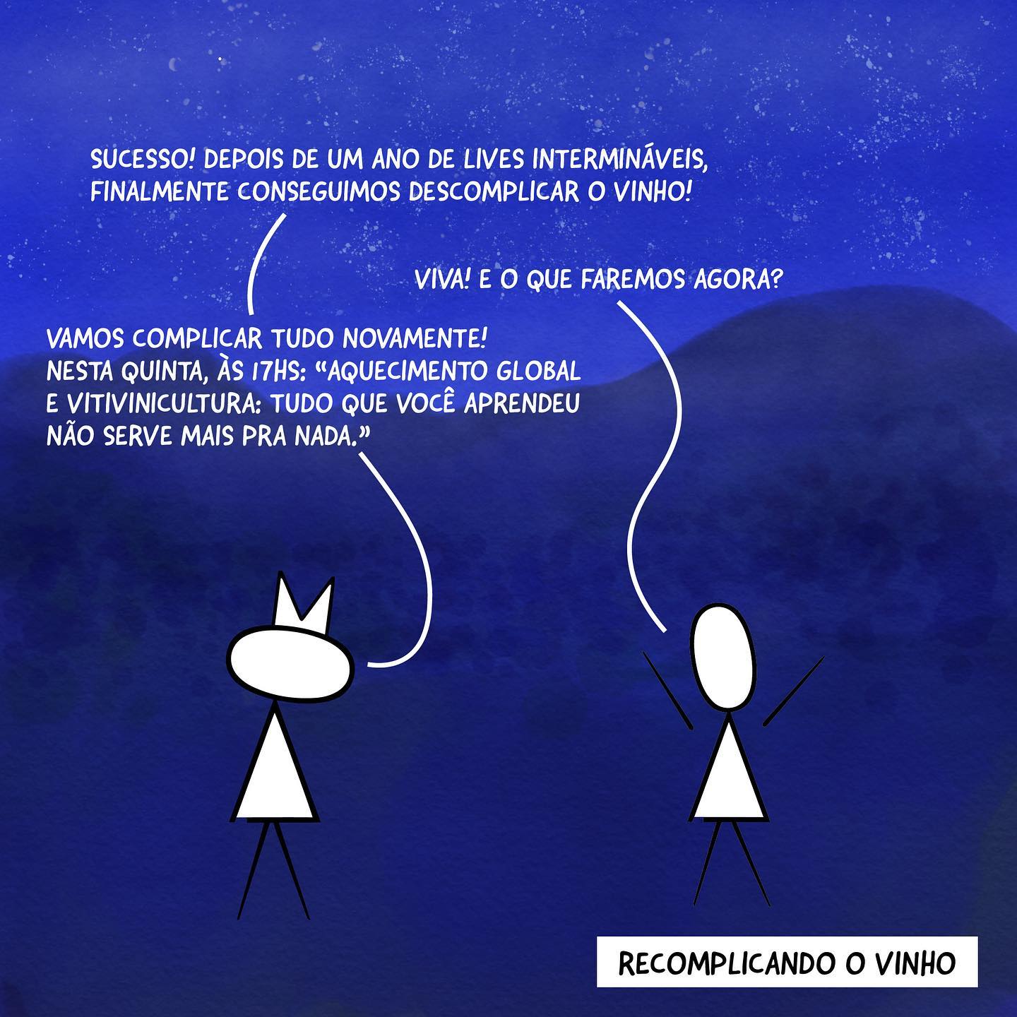 Quadro 1: Personagem 1: "SUCESSO! DEPOIS DE UM ANO DE LIVES INTERMINÁVEIS, FINALMENTE CONSEGUIMOS DESCOMPLICAR O VINHO!" Personagem 2: "VIVA! E O QUE FAREMOS AGORA?"