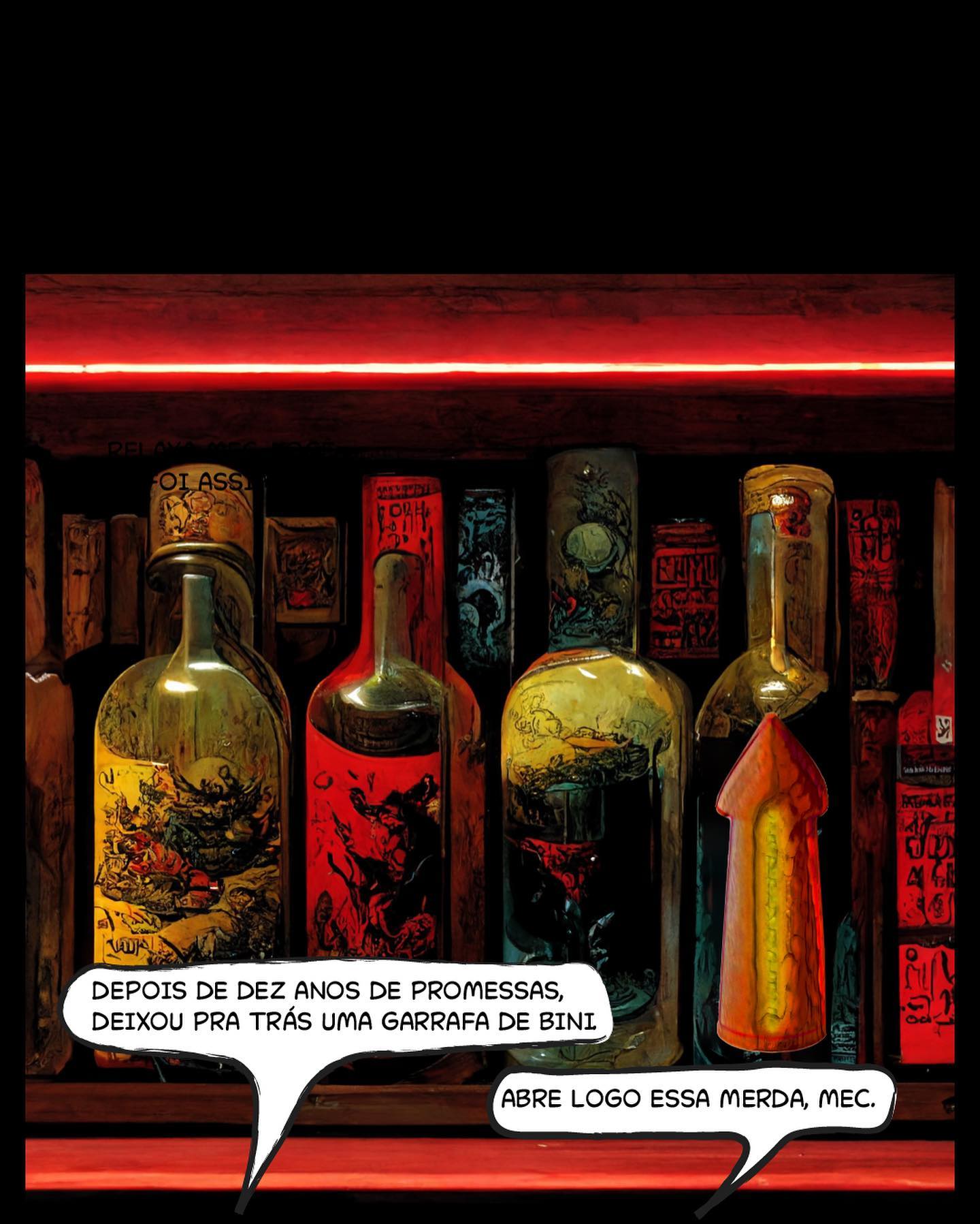 • 5: Foco na garrafa deixada por Toni (com uma seta laranja no rótulo): "DEPOIS DE DEZ ANOS DE PROMESSAS, DEIXOU PRA TRÁS UMA GARRAFA DE BINI". Tina ordena: "ABRE LOGO ESSA MERDA, MEC."