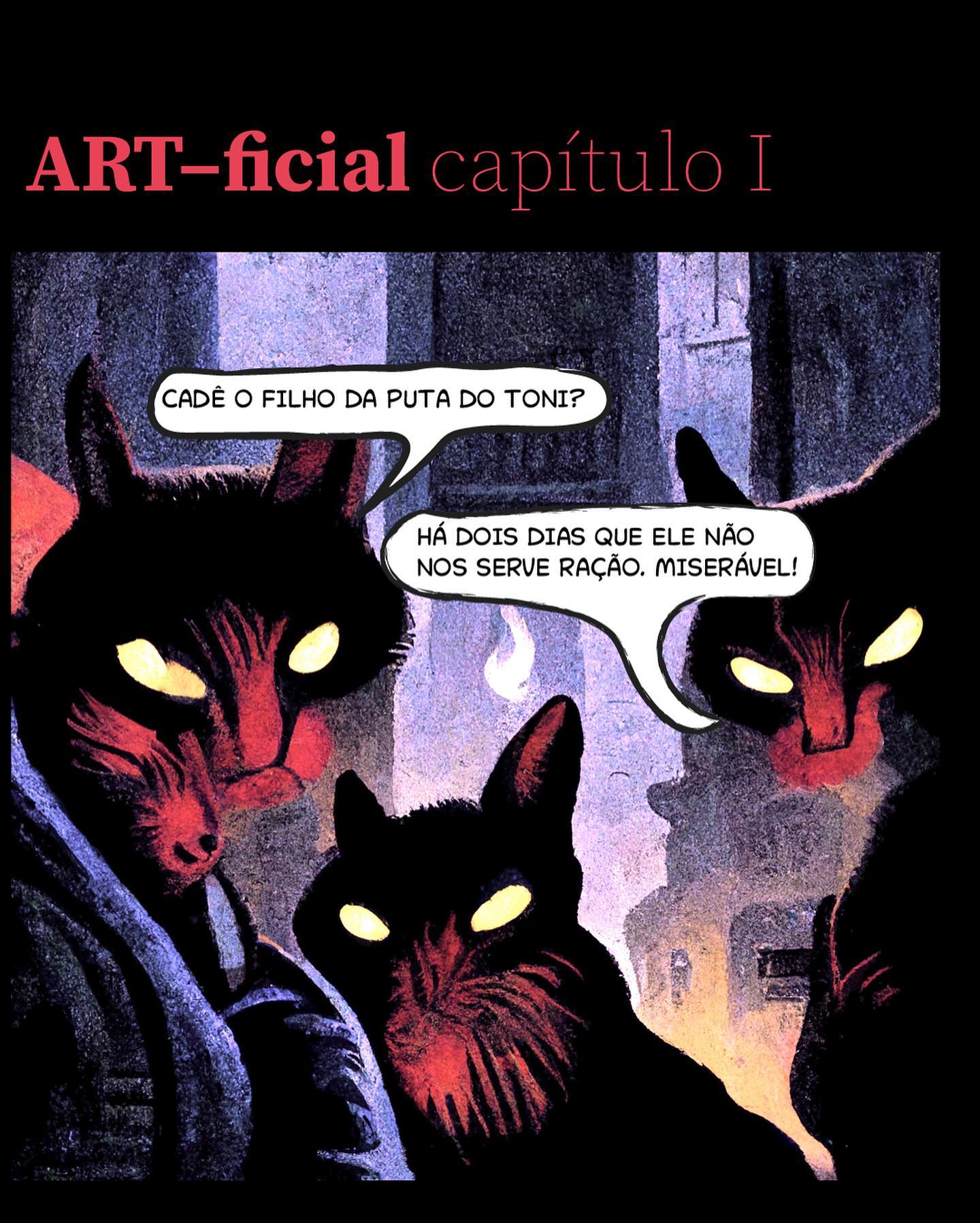 • 10: Cena com três gatos pretos de olhos amarelos brilhantes. Título em vermelho: "ART–ficial capítulo I". Gato 1: "CADÊ O FILHO DA PUTA DO TONI?". Gato 2: "HÁ DOIS DIAS QUE ELE NÃO NOS SERVE RAÇÃO. MISERÁVEL!"