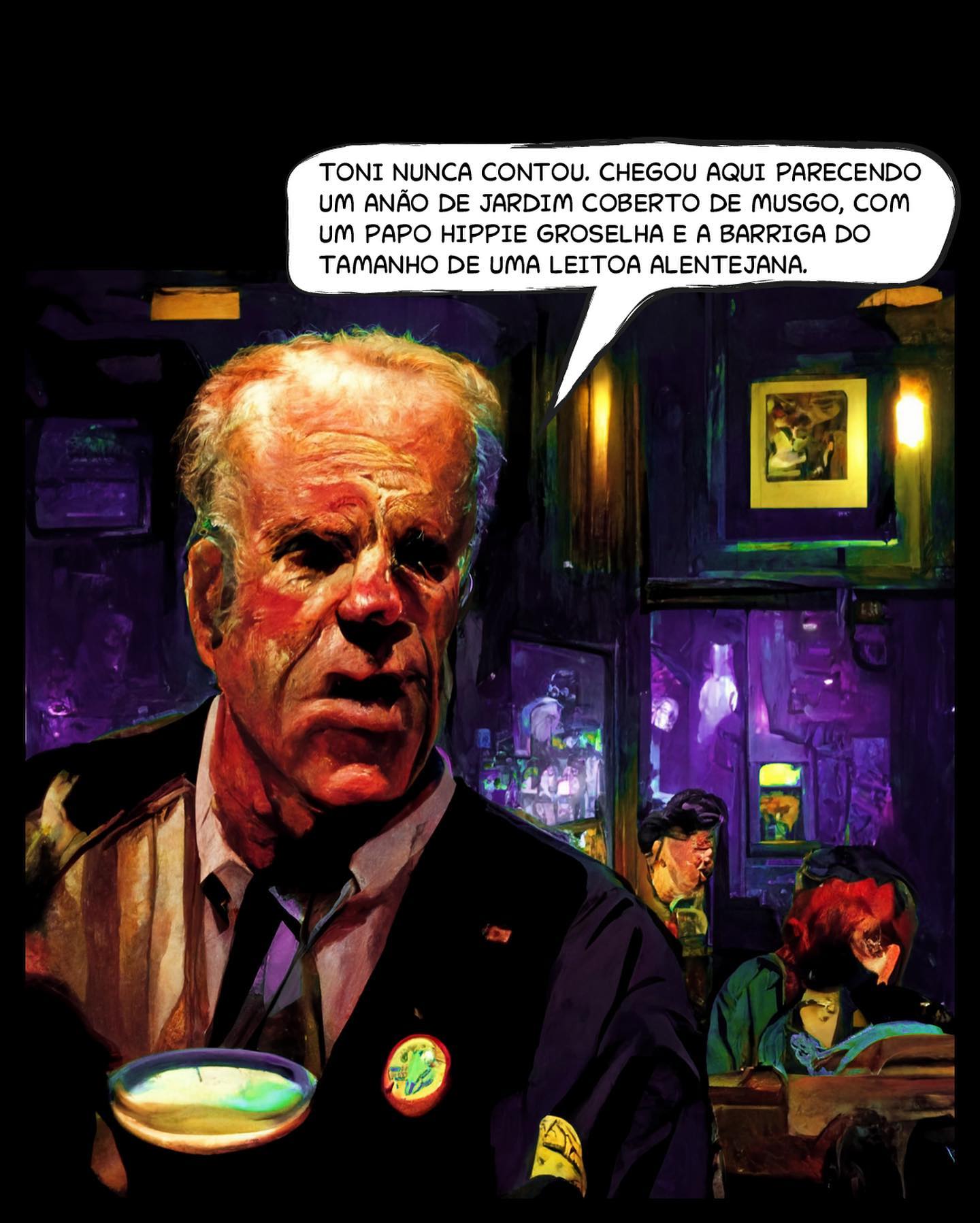 • 3: Close em um homem idoso no bar: "TONI NUNCA CONTOU. CHEGOU AQUI PARECENDO UM ANÃO DE JARDIM COBERTO DE MUSGO, COM UM PAPO HIPPIE GROSELHA E A BARRIGA DO TAMANHO DE UMA LEITOA ALENTEJANA."