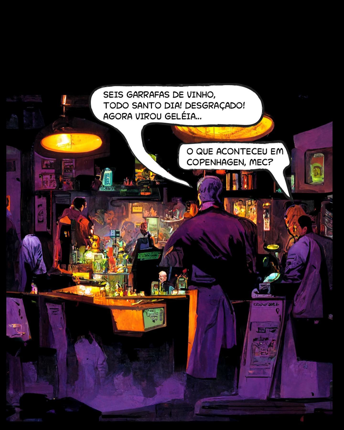 • 2: Visão traseira do balcão. Mec continua: "SEIS GARRAFAS DE VINHO, TODO SANTO DIA! DESGRAÇADO! AGORA VIROU GELÉIA...". Alguém pergunta: "O QUE ACONTECEU EM COPENHAGEN, MEC?"
