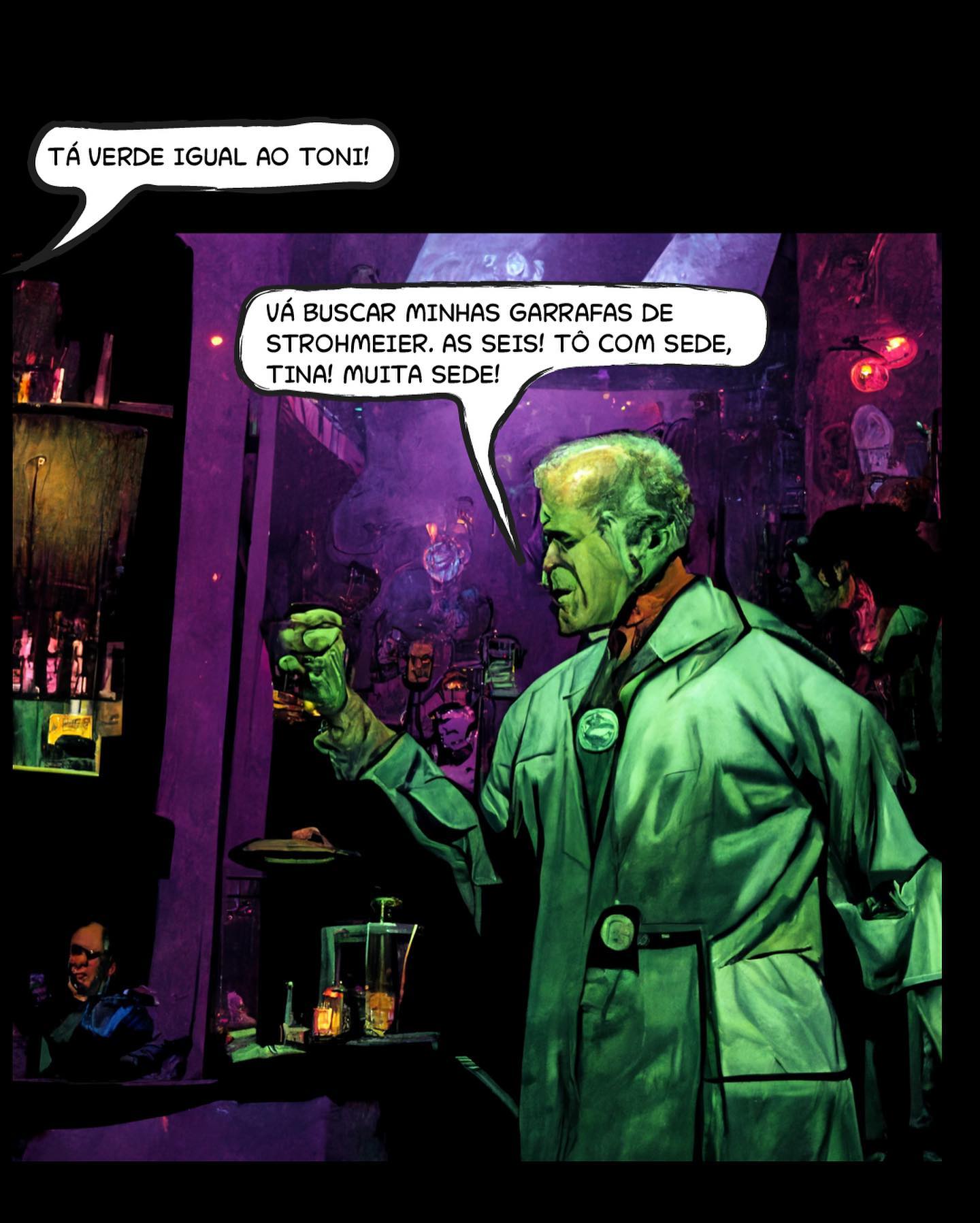 • 9: Mec, agora com a pele esverdeada, grita desesperado: "TÁ VERDE IGUAL AO TONI! VÁ BUSCAR MINHAS GARRAFAS DE STROHMEIER. AS SEIS! TÔ COM SEDE, TINA! MUITA SEDE!"