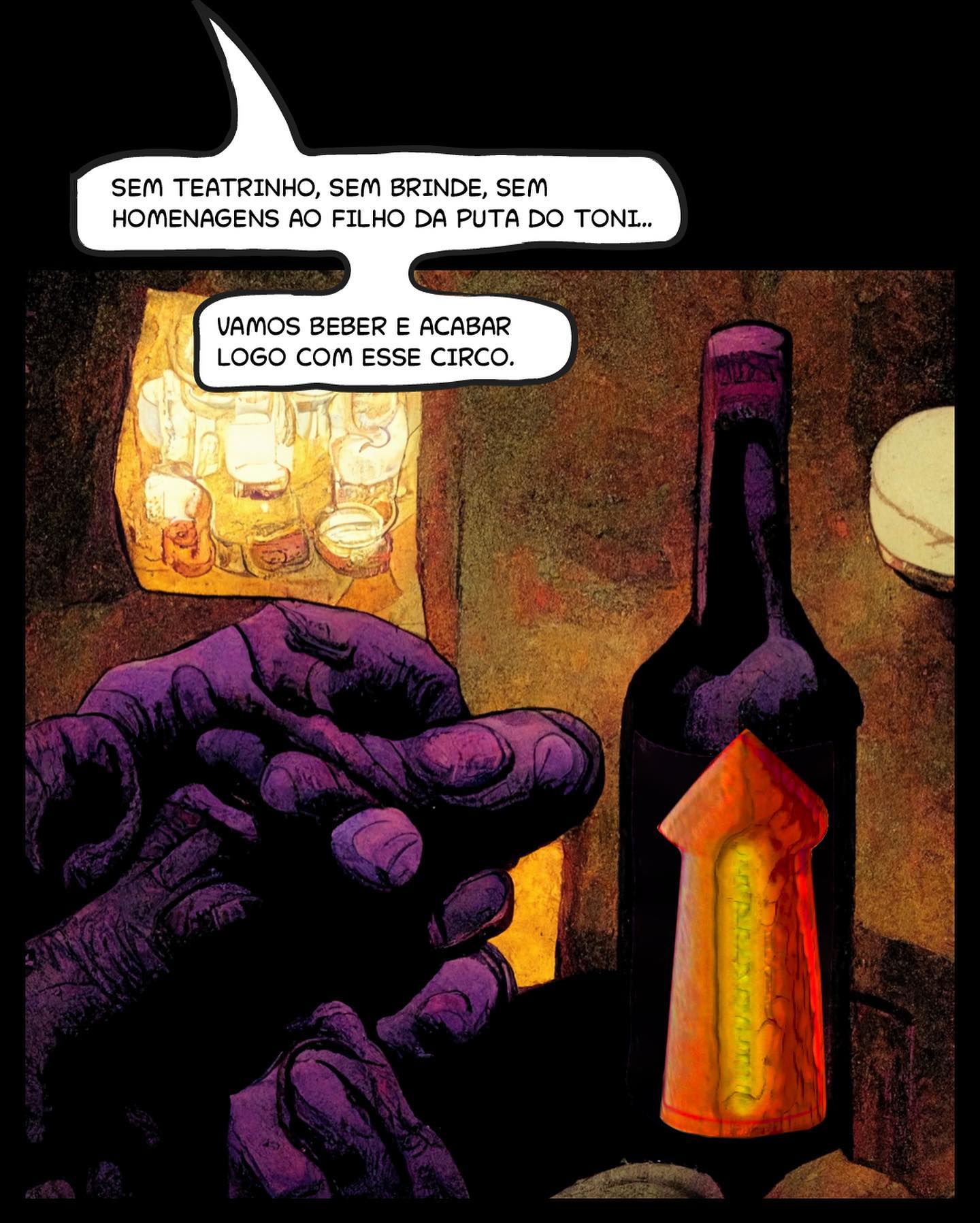 • 6: Mão roxa sobre a garrafa: "SEM TEATRINHO, SEM BRINDE, SEM HOMENAGENS AO FILHO DA PUTA DO TONI... VAMOS BEBER E ACABAR LOGO COM ESSE CIRCO."
