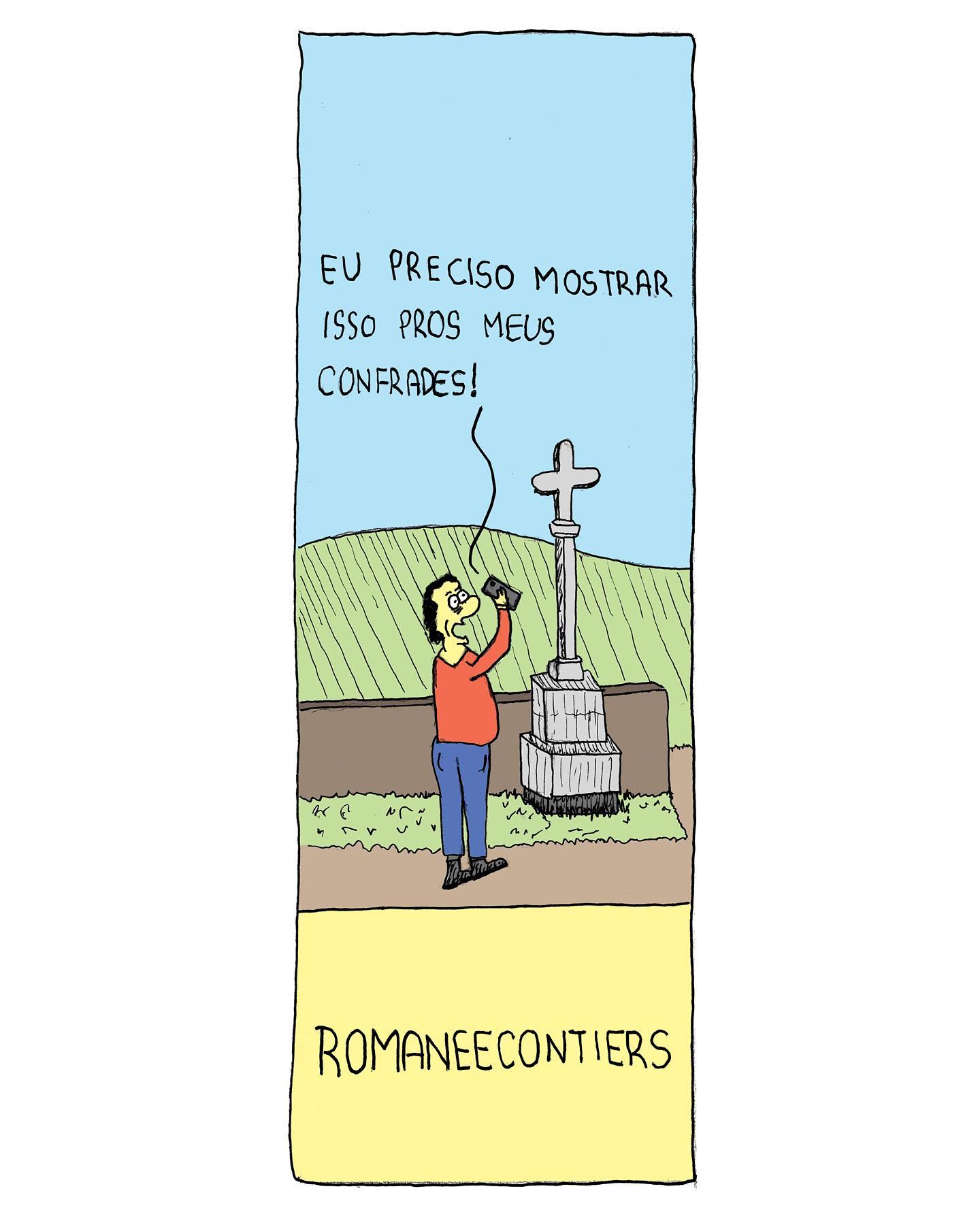 - Romaneecontiers: Um homem tira uma selfie ao lado de um cruzeiro de pedra em um vinhedo (referência ao icônico marco da Romanée-Conti). Ele diz: "Eu preciso mostrar isso pros meus confrades!".