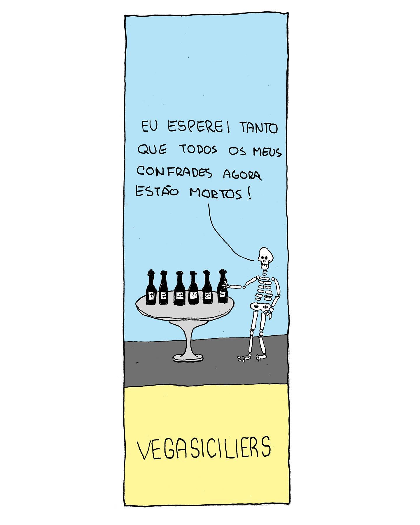 - Vegasiciliers: Um esqueleto está de pé ao lado de uma mesa com várias garrafas de vinho escuras (Vega Sicilia). O esqueleto diz: "Eu esperei tanto que todos os meus confrades agora estão mortos!".