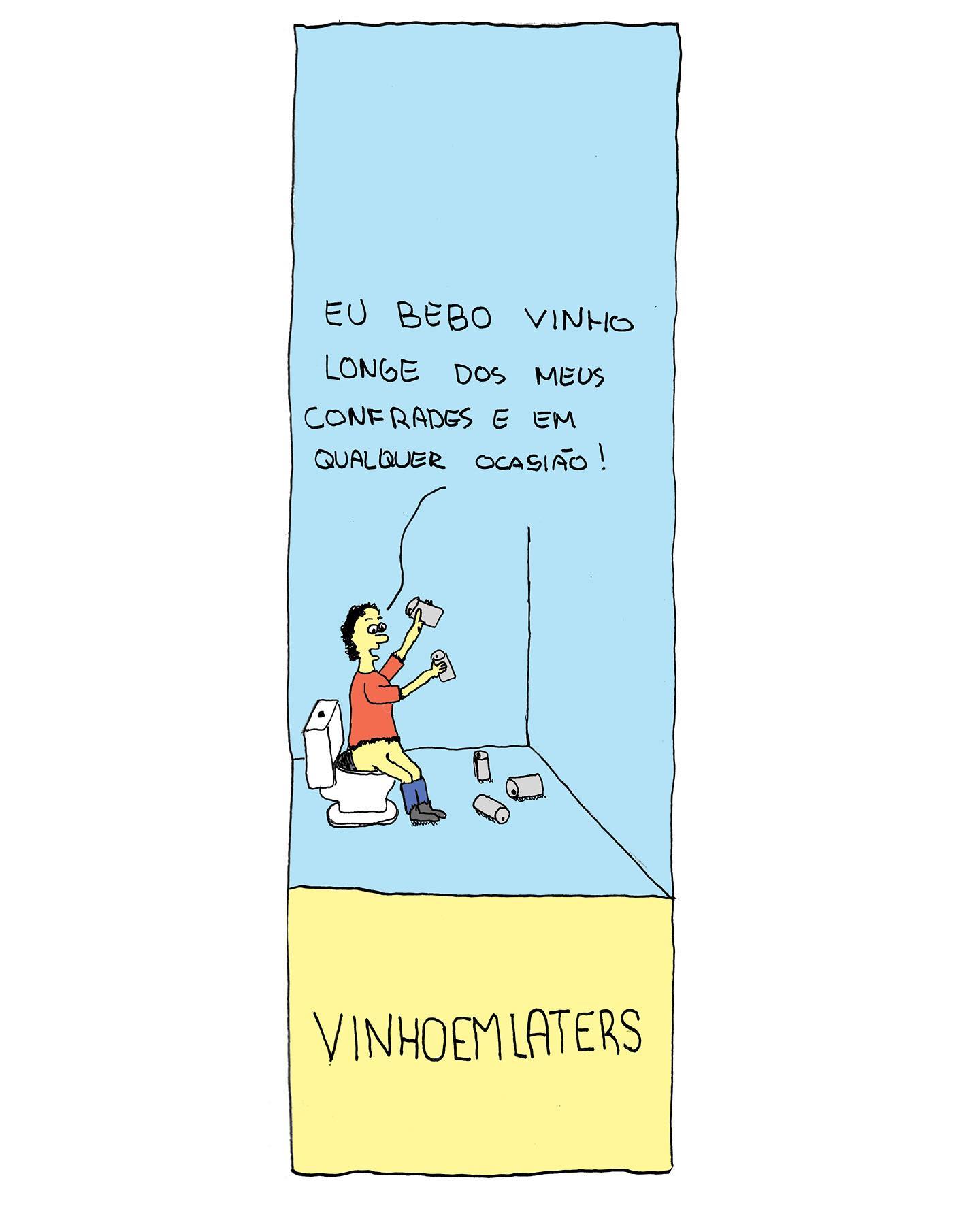 - Vinhoemlaters: Um homem está sentado no vaso sanitário, bebendo uma lata de vinho, cercado por latas vazias no chão. Ele diz: "Eu bebo vinho longe dos meus confrades e em qualquer ocasião!".