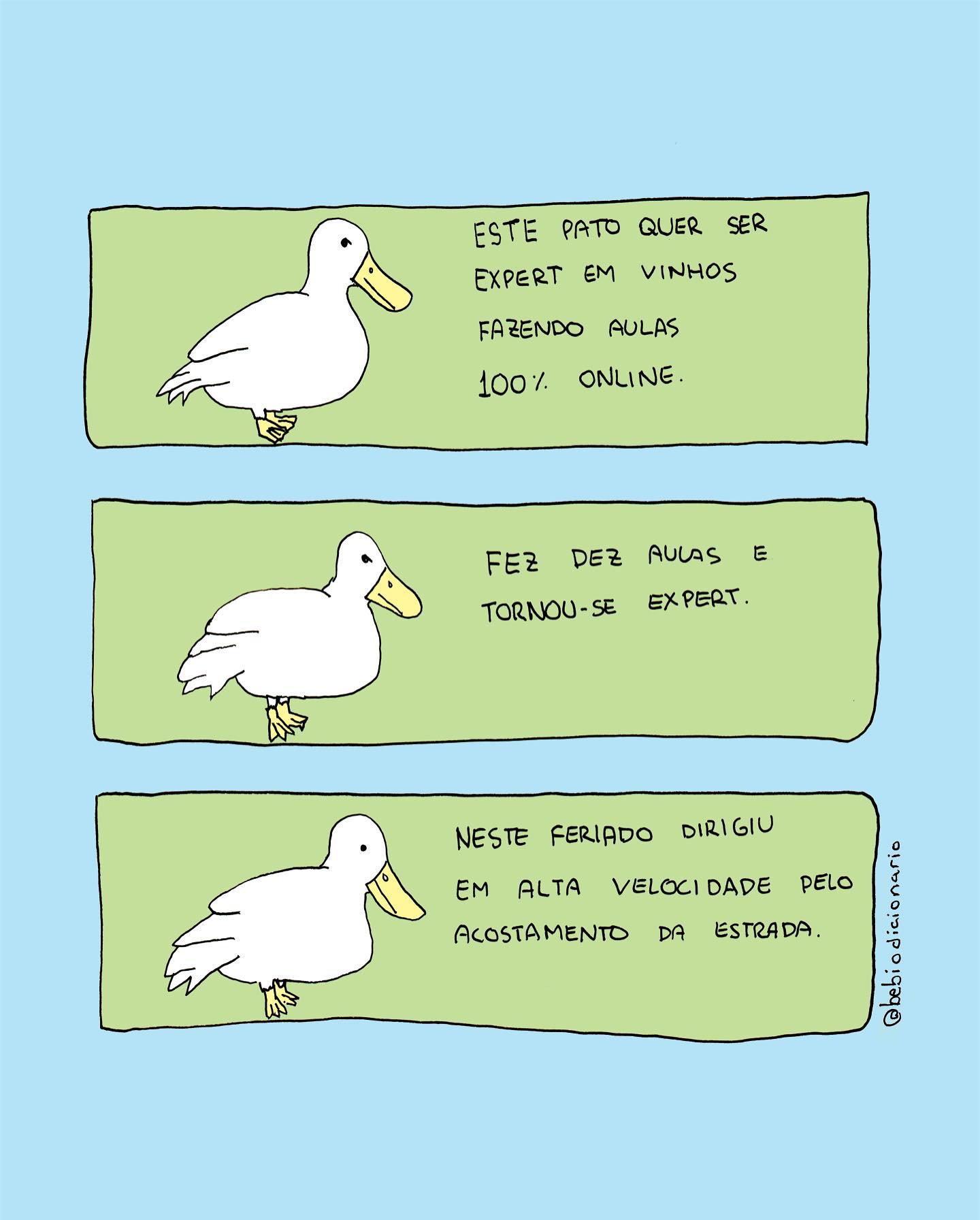 Painel 2: (O mesmo desenho do pato.) Texto: "FEZ DEZ AULAS E TORNOU-SE EXPERT."