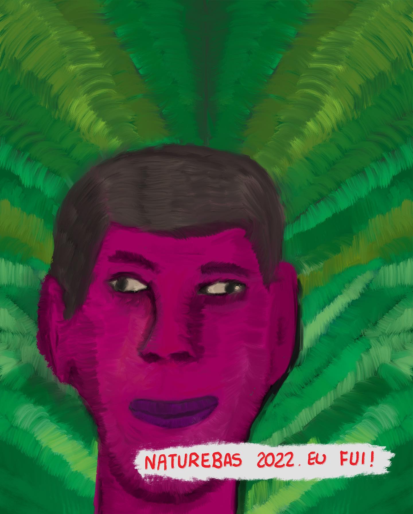 • Cores Vibrantes: O fundo verde neon e a pele rosa evocam a intensidade sensorial, a energia caótica e a atmosfera festiva (e às vezes psicodélica) que caracteriza a feira Naturebas, famosa por ser menos formal e mais agitada que as feiras de vinho tradicionais.