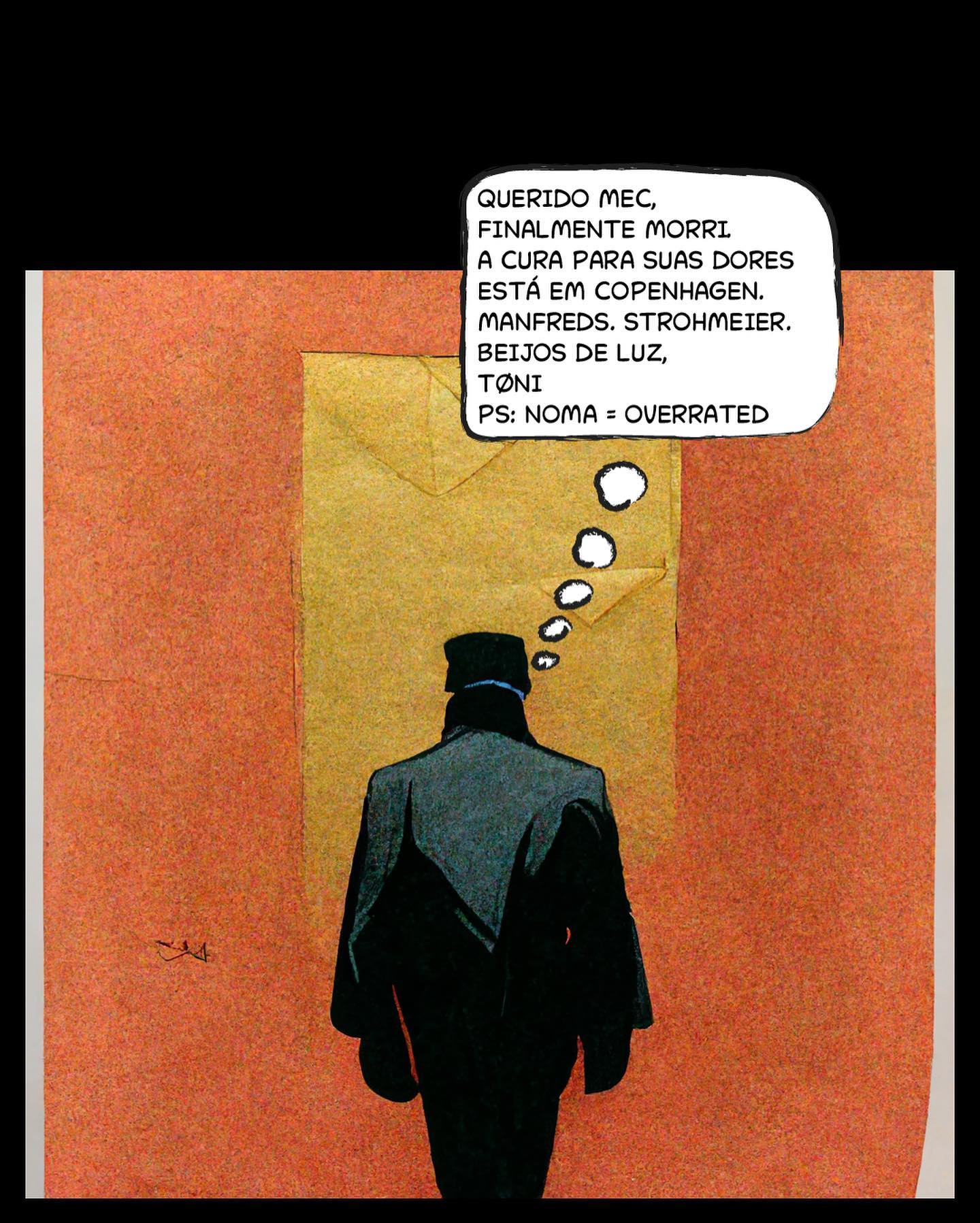 - Pensamento (Carta de Toni): "QUERIDO MEC, FINALMENTE MORRI A CURA PARA SUAS DORES ESTÁ EM COPENHAGEN. MANFREDS. STROHMEIER. BEIJOS DE LUZ, TØNI PS: NOMA = OVERRATED"