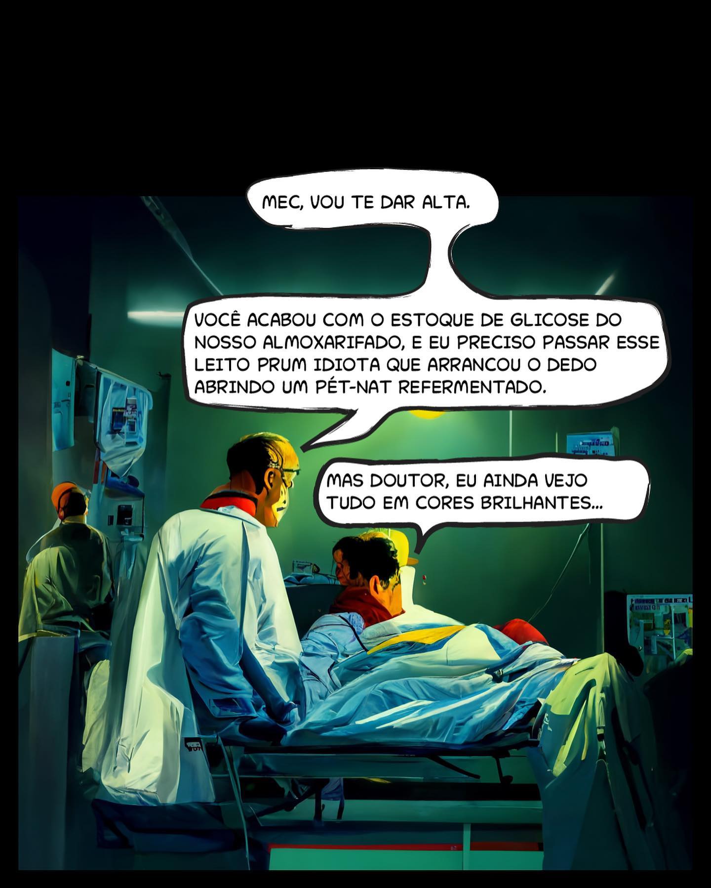 - Médico: "VOCÊ ACABOU COM O ESTOQUE DE GLICOSE DO NOSSO ALMOXARIFADO, E EU PRECISO PASSAR ESSE LEITO PRUM IDIOTA QUE ARRANCOU O DEDO ABRINDO UM PÉT-NAT REFERMENTADO."