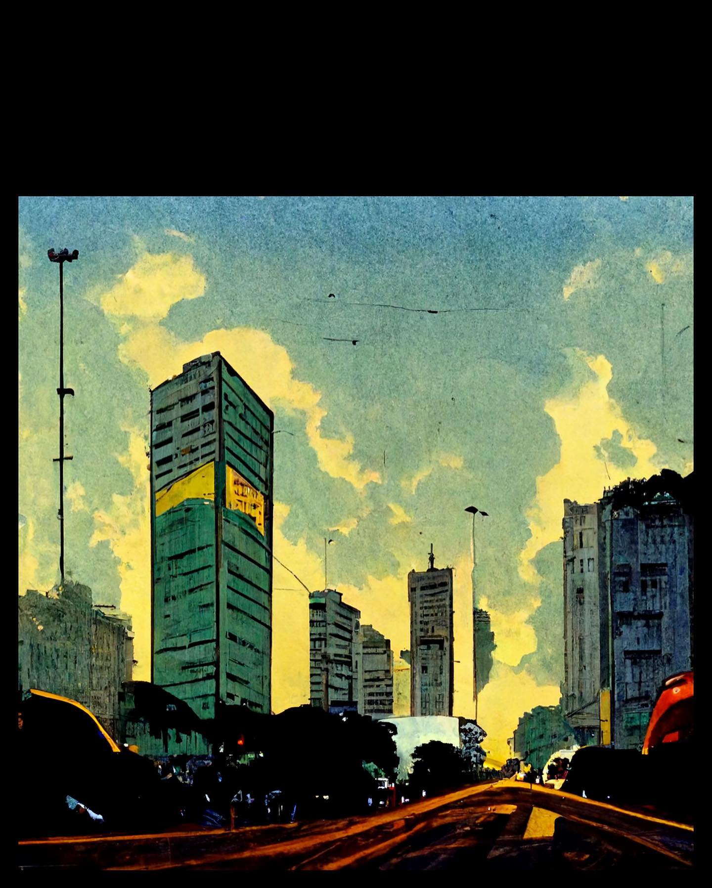 5: Paisagem urbana impressionista com prédios altos e céu nublado. (Sem textos ou falas).