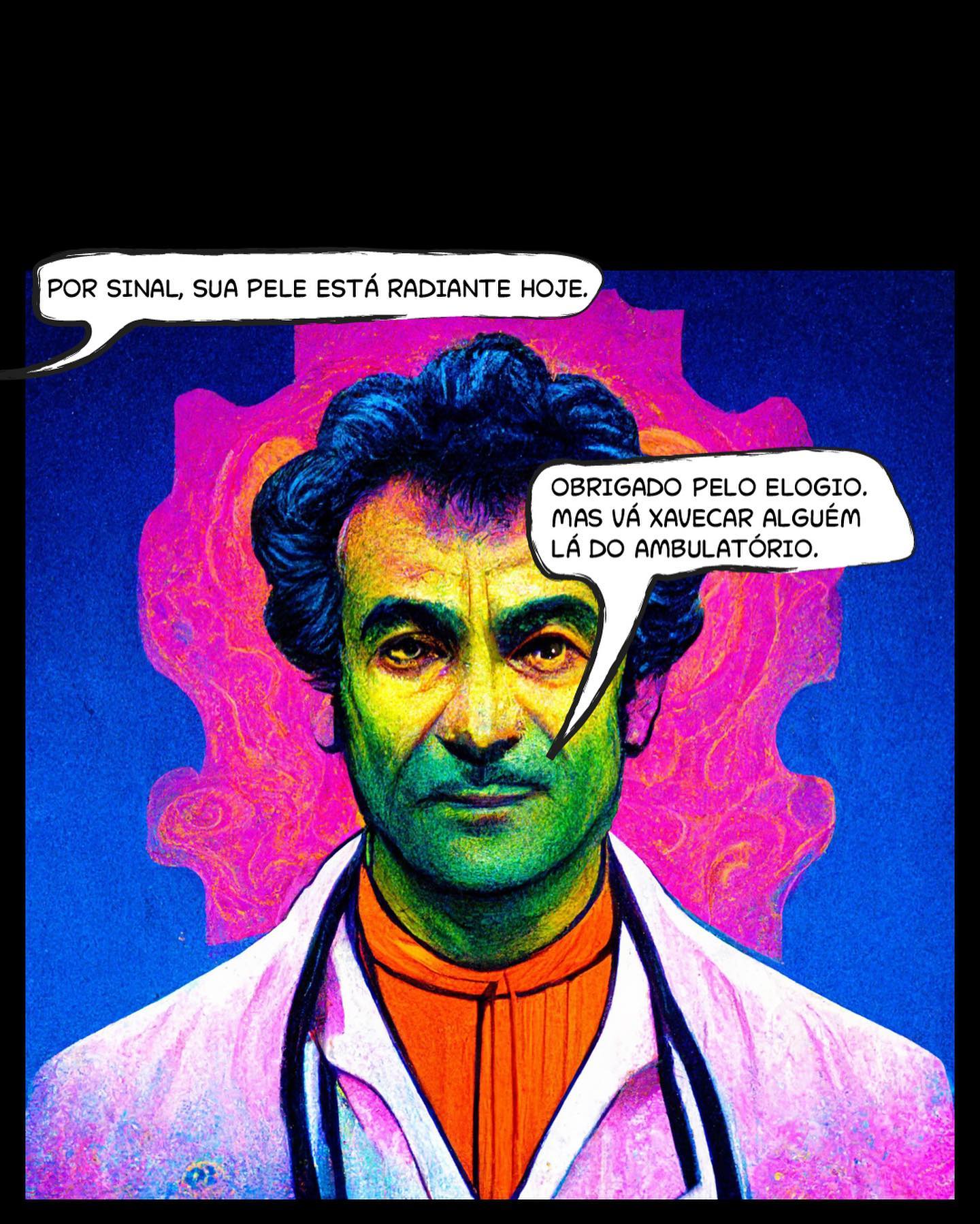 2: Close-up do rosto do médico com pele verde texturizada e fundo psicodélico.