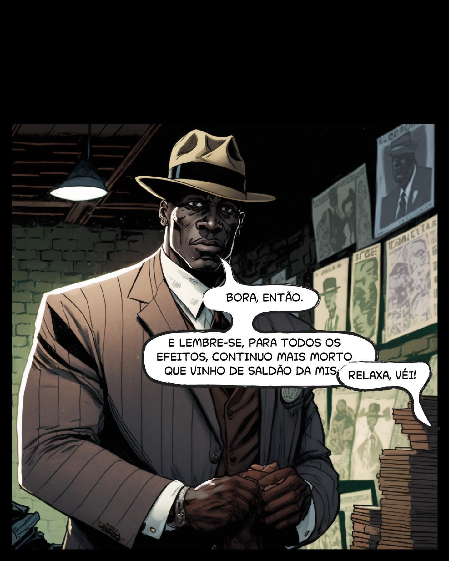 Painel 4 Toni continua o plano. Toni: "BORA, ENTÃO. E LEMBRE-SE, PARA TODOS OS EFEITOS, CONTINUO MAIS MORTO QUE VINHO DE SALDÃO DA MISTRAL." Guy (fora de quadro): "RELAXA, VÉI!"