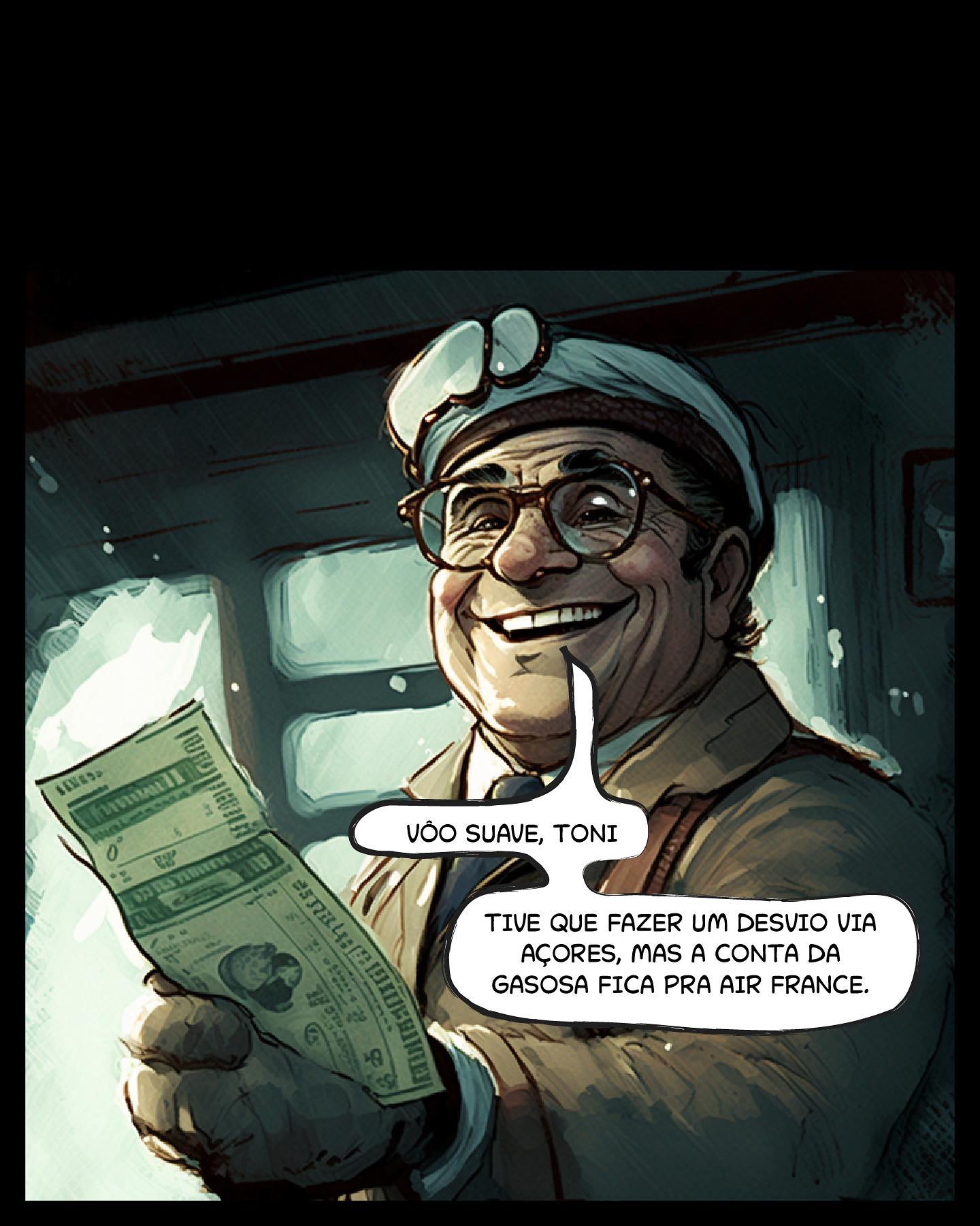 Painel 2 O piloto Guy, sorridente, segurando dinheiro. Guy: "VÔO SUAVE, TONI. TIVE QUE FAZER O DESVIO VIA AÇORES, MAS A CONTA DA GASOSA FICA PRA AIR FRANCE."