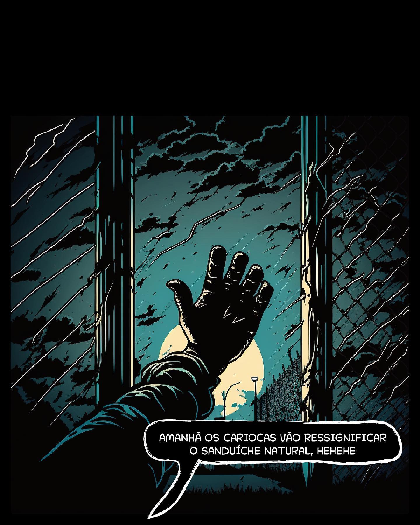 Painel 7 Mão sinistra segurando uma grade sob chuva e céu verde tóxico. Balão: "AMANHÃ OS CARIOCAS VÃO RESSIGNIFICAR O SANDUÍCHE NATURAL, HEHEHE"