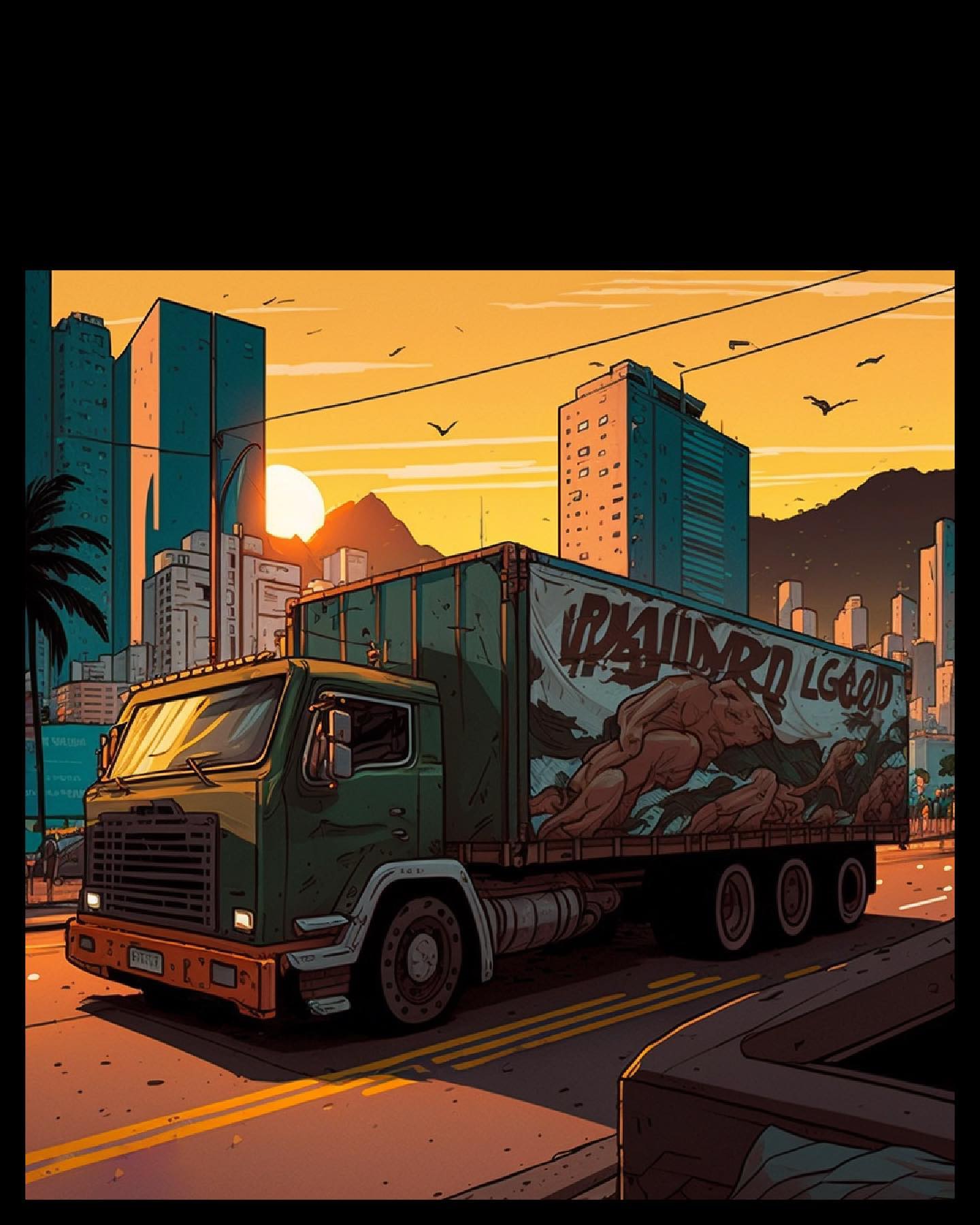 Painel 5 Caminhão de carga atravessando a cidade ao pôr do sol. Na lateral, um grafite ilegível que lembra "CABALLO LOCO" e figuras grotescas.