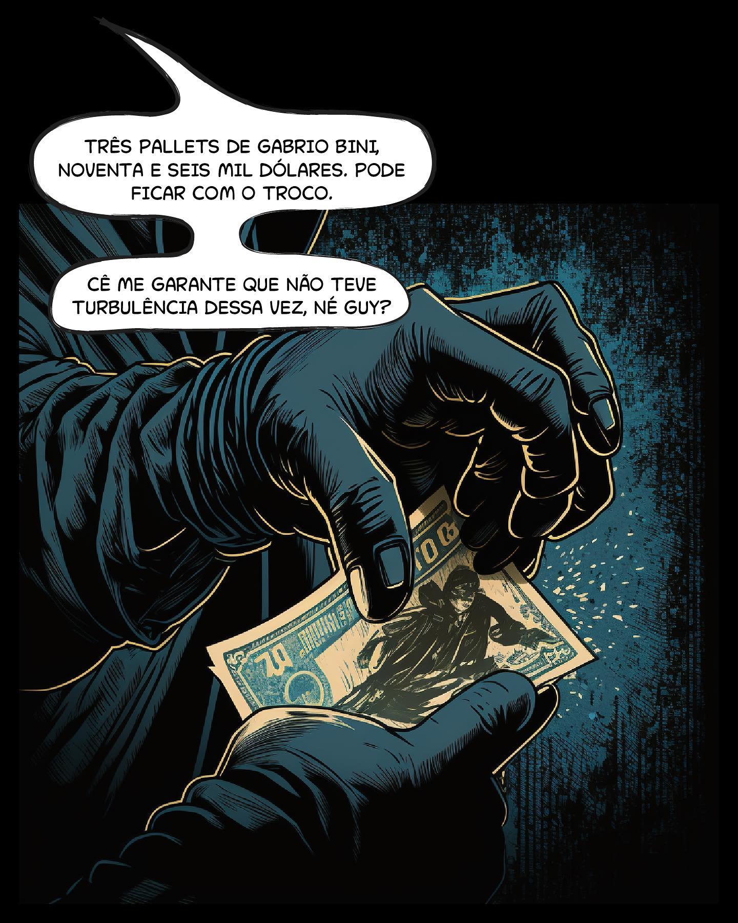 Painel 1 Mãos enluvadas trocando dinheiro por uma garantia. Guy (Aviador): "TRÊS PALLETS DE GABRIO BINI, NOVENTA E SEIS MIL DÓLARES. PODE FICAR COM O TROCO." Toni (Comparsa): "CÊ ME GARANTE QUE NÃO TEVE TURBULÊNCIA DESSA VEZ, NÉ GUY?"