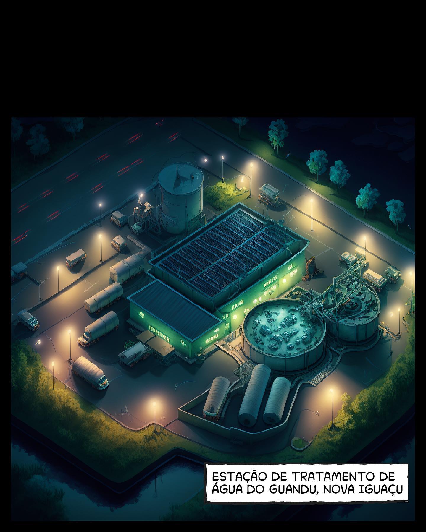 Painel 6 Vista aérea noturna de uma estação de tratamento de água. Caixa de Texto: ESTAÇÃO DE TRATAMENTO DE ÁGUA DO GUANDU, NOVA IGUAÇU