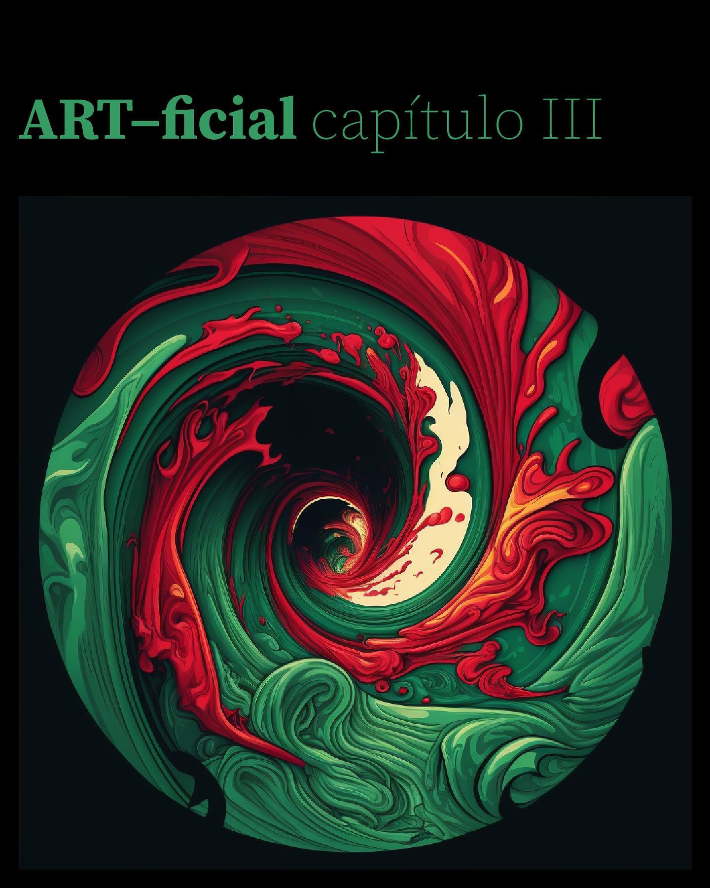 Painel 9 Imagem abstrata de um redemoinho verde e vermelho (água e o tóxico misturados). Texto: ART-ficial capítulo III